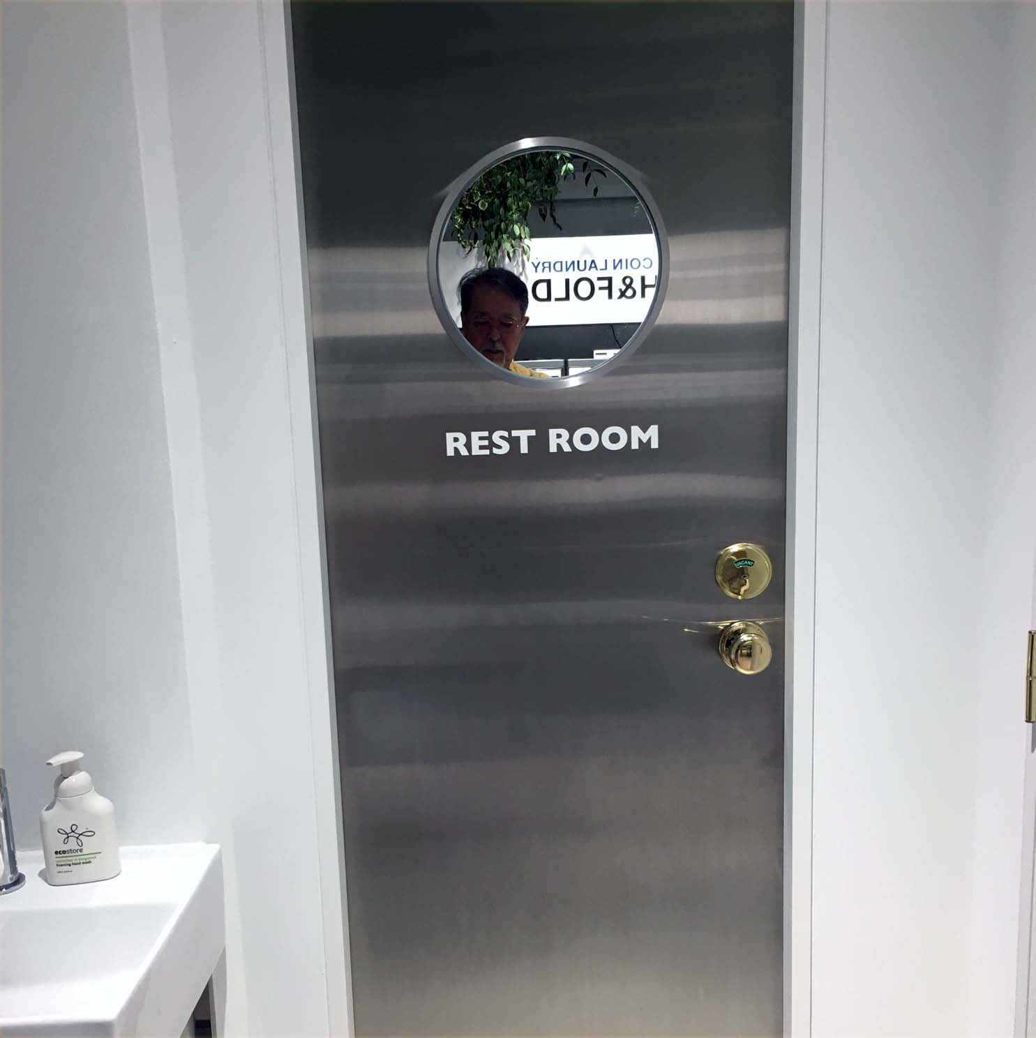 お店もそうなら、トイレも。我が国ではトイレと記されることが多いのですが、ここではレストルーム(REST ROOM)と記されています。写真9-6、写真9-7