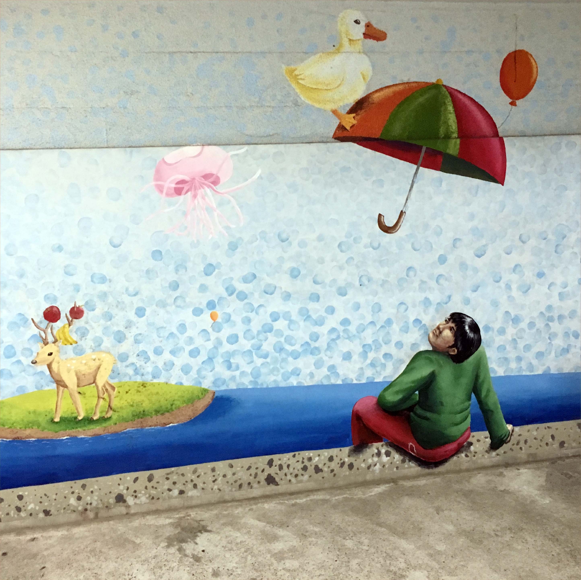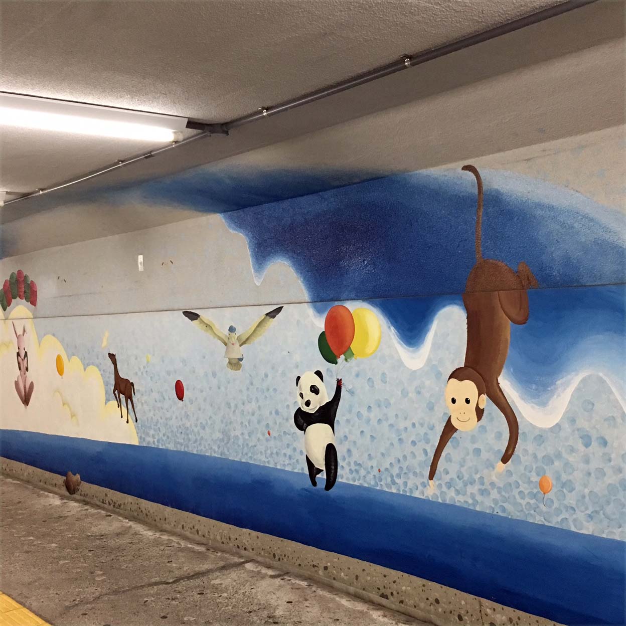 小さな駅ですが、構内の地下通路には写真の様な絵が描かれていました。夏バージョンなので、時期によって変わるのか見てみたいです。写真9-9、写真9-10、写真9-11
