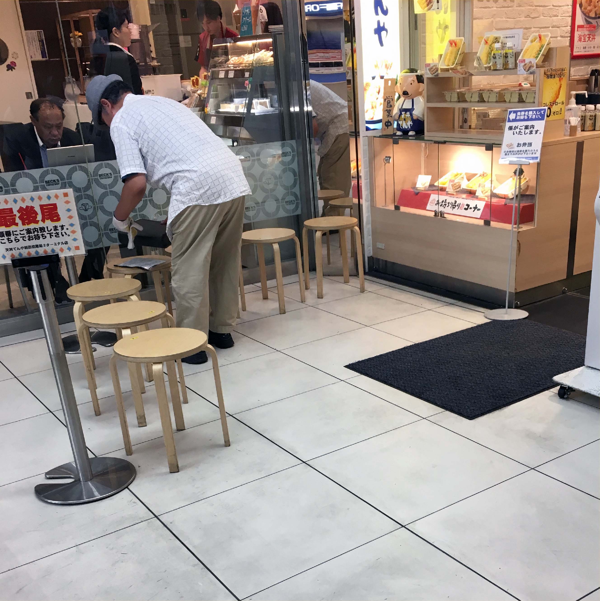 浜松町で本屋に行くつもりでモノレールに乗ろうと向かっていると、店(天丼屋)の前に椅子を出している場に合いました。そう言えば、機材商のT社長に「クリーニング屋で並ぶ人のために何かの工夫をしているのを見たことが無いと」言われたのを思い出しました。写真9-2。