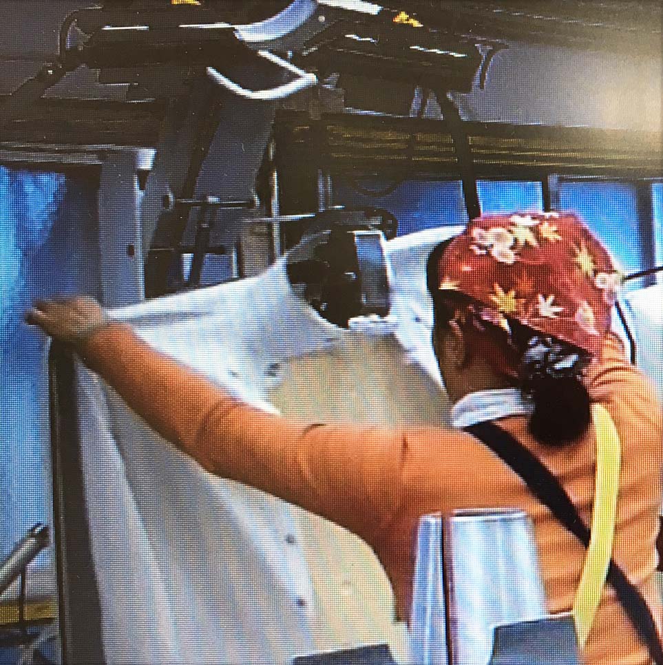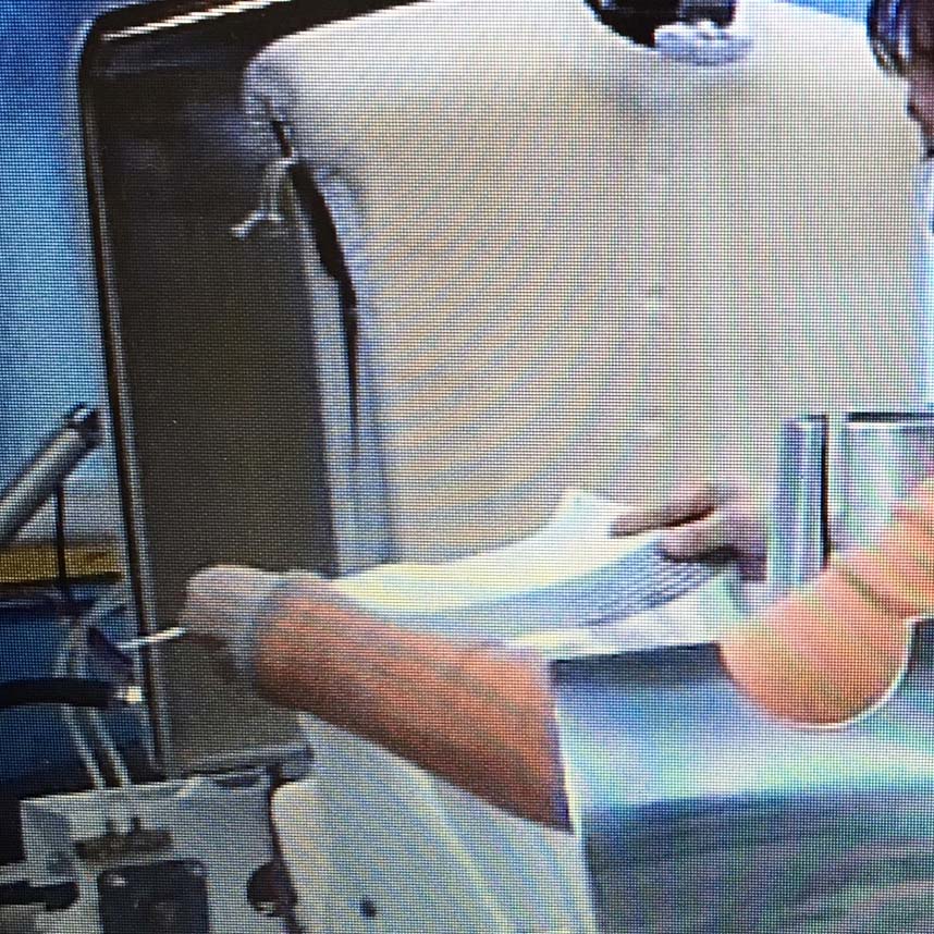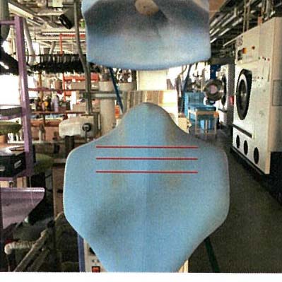 下の写真はカラープレスですが、これに基準線を入れなさいと再三注意するのですが未だに入っていません。(写真10-13)。「基準線が無いと上着が曲がって仕上がる事があるよ」と何度言っても直りません。