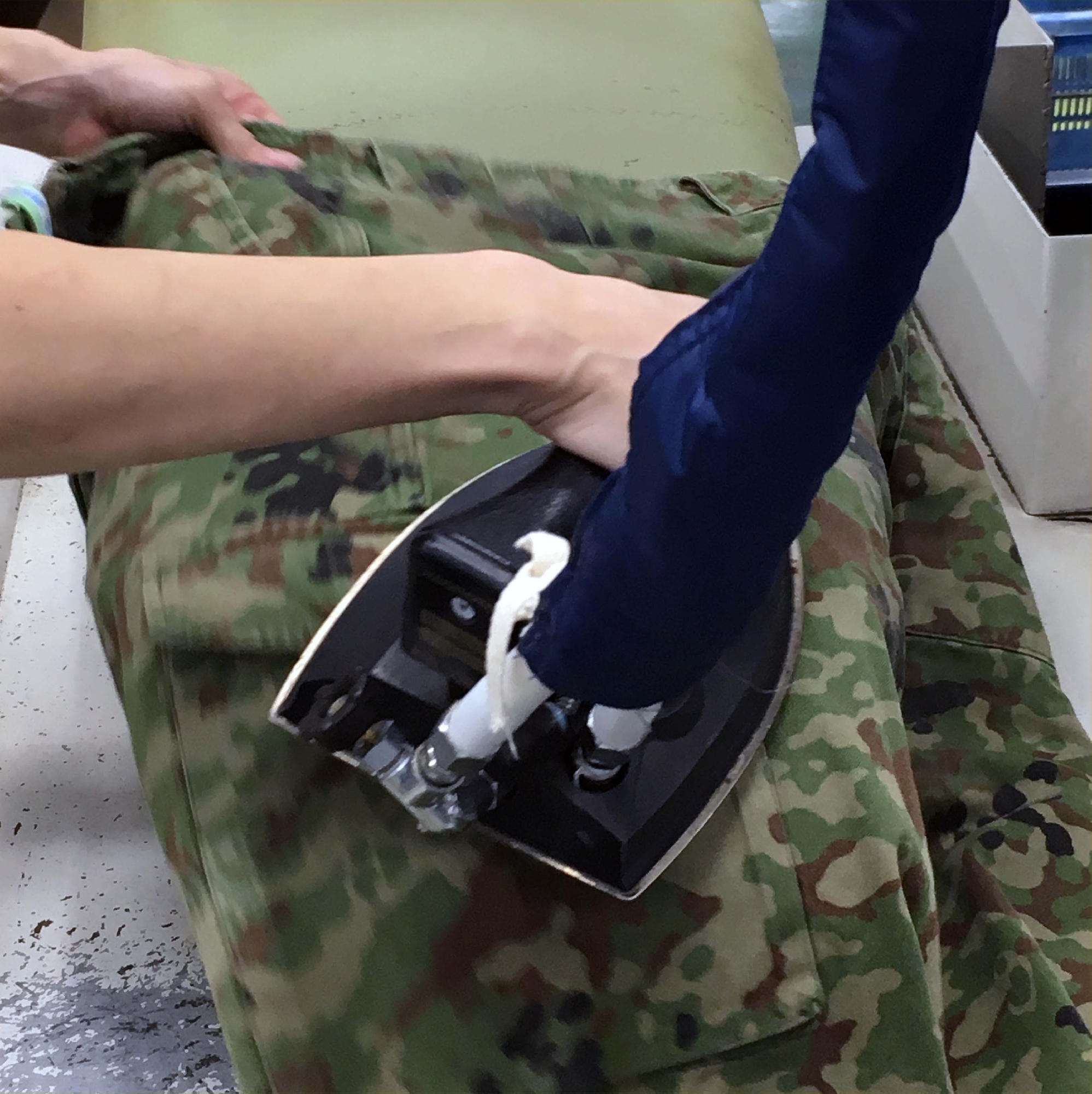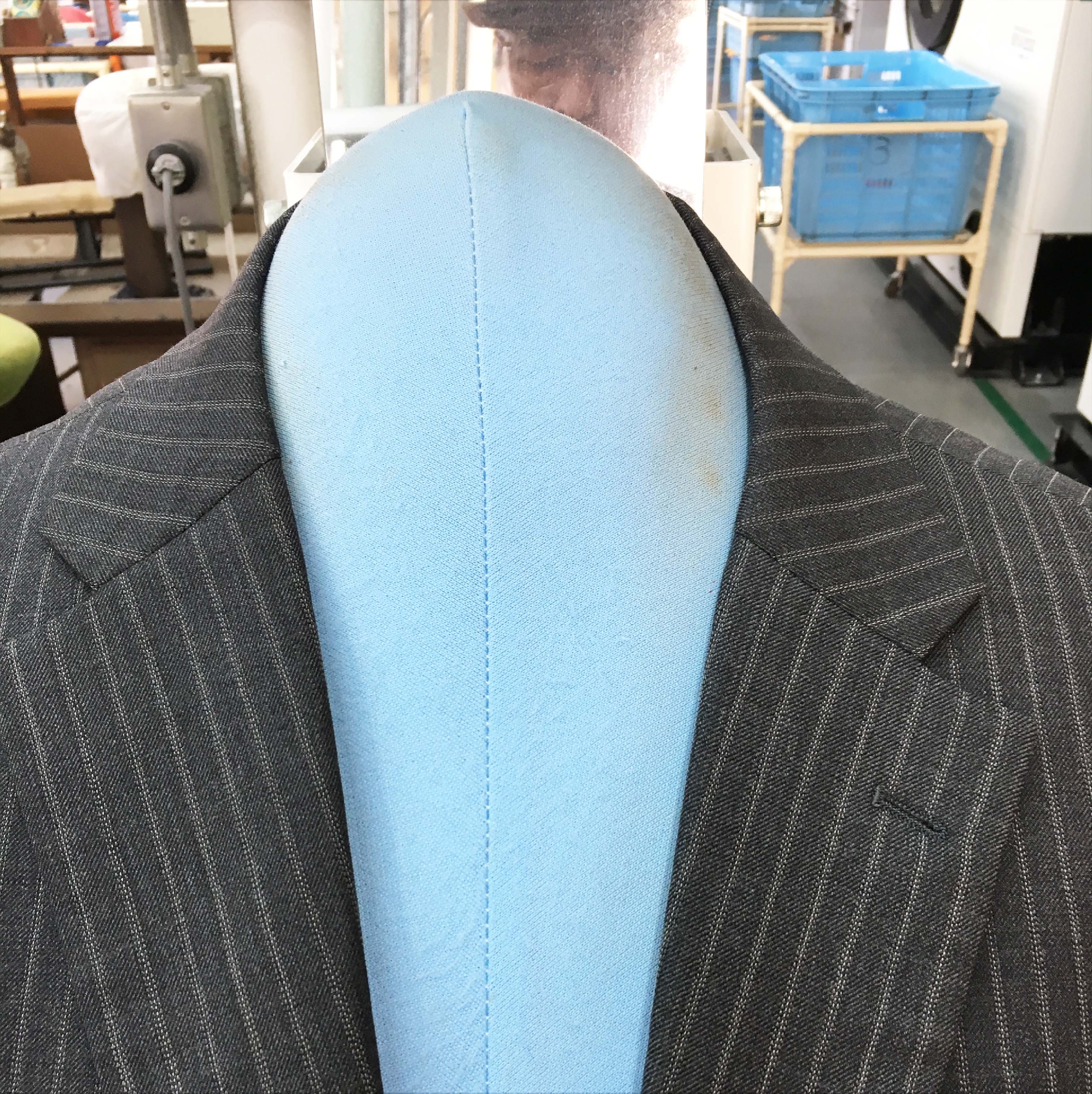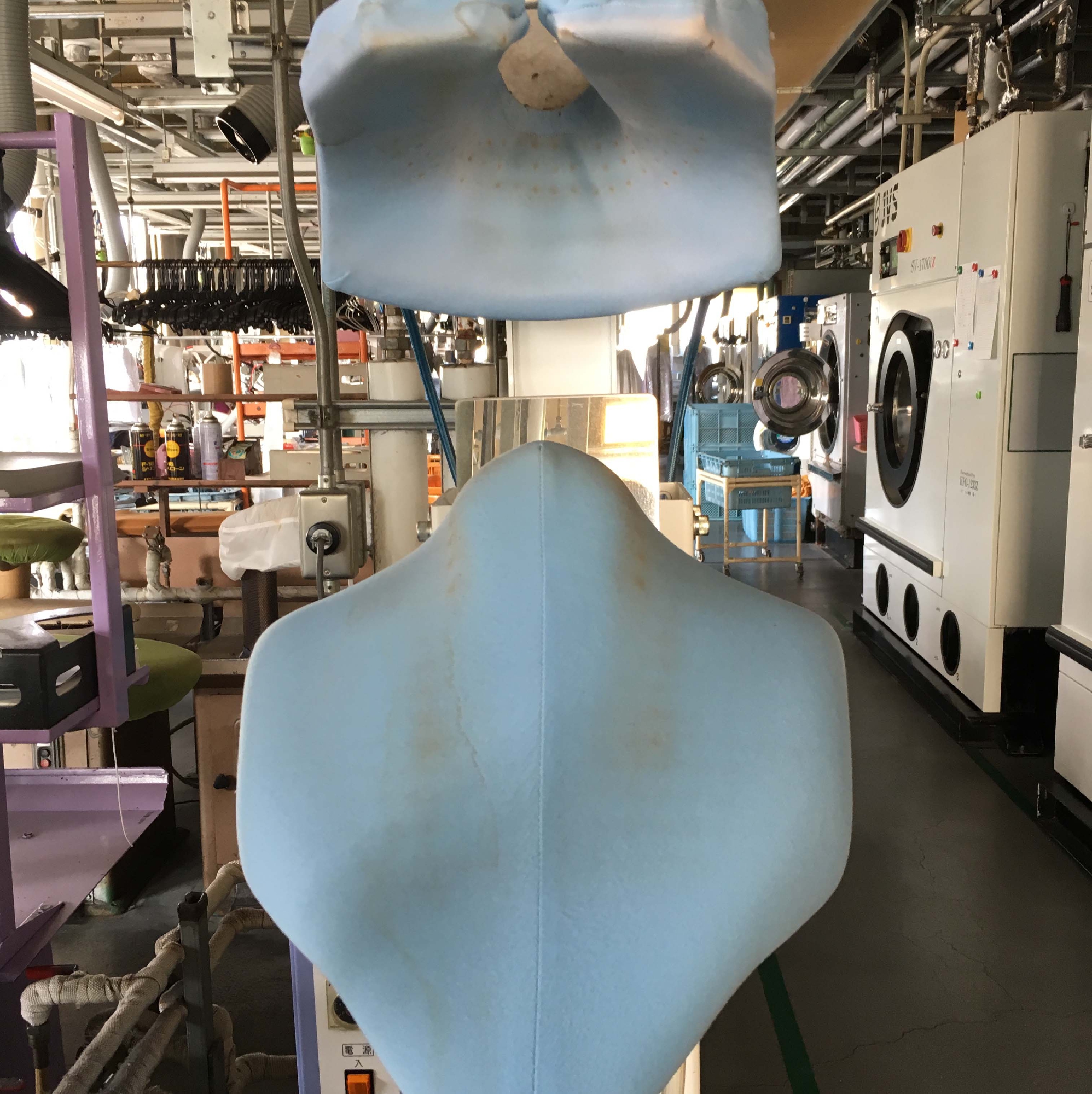 現場では、仕上時に蒸気を使うと硬化するので、手で出来るだけ引っ張って、アイロンで蒸気を出さないで仕上げます。当然、ズボンプレスは使えません。