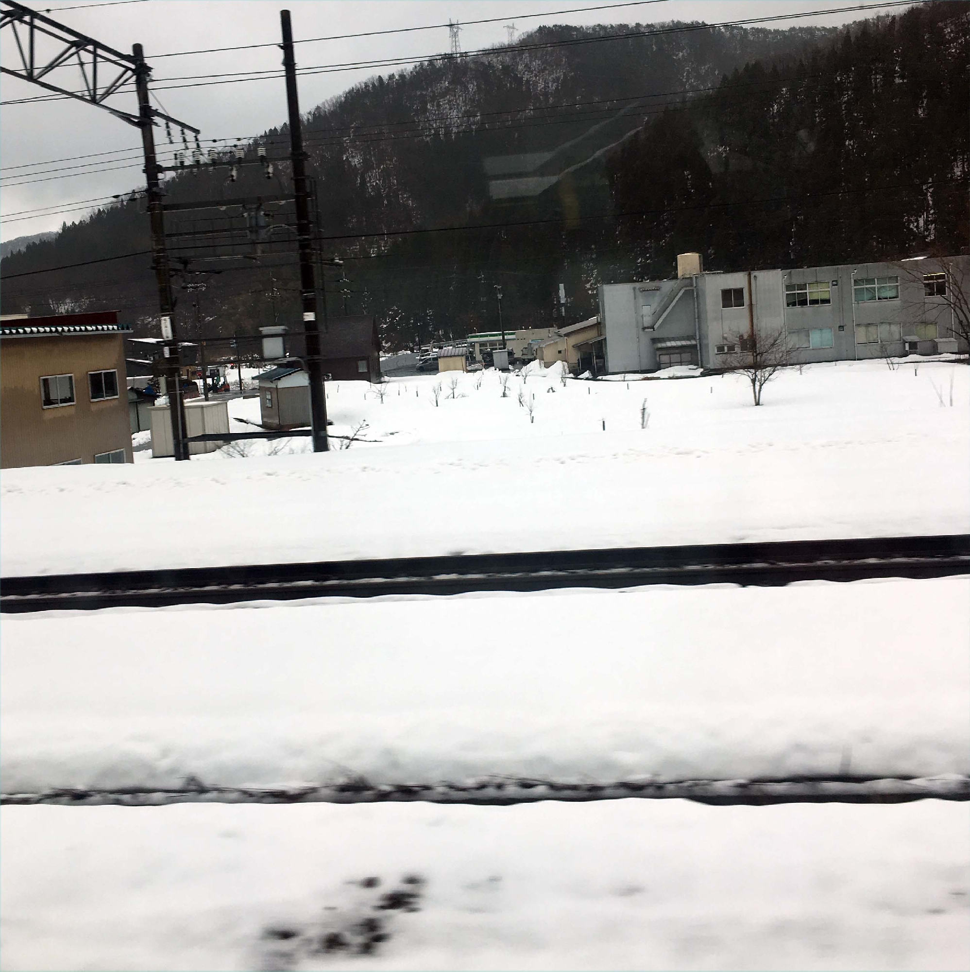 サンダーバードで福井に向かいました。トンネルを過ぎるとそこは雪だった、その通りで一面雪景色でした。写真12-55、JR北陸本線今庄付近。写真12-56、JR北陸本線鯖波付近。