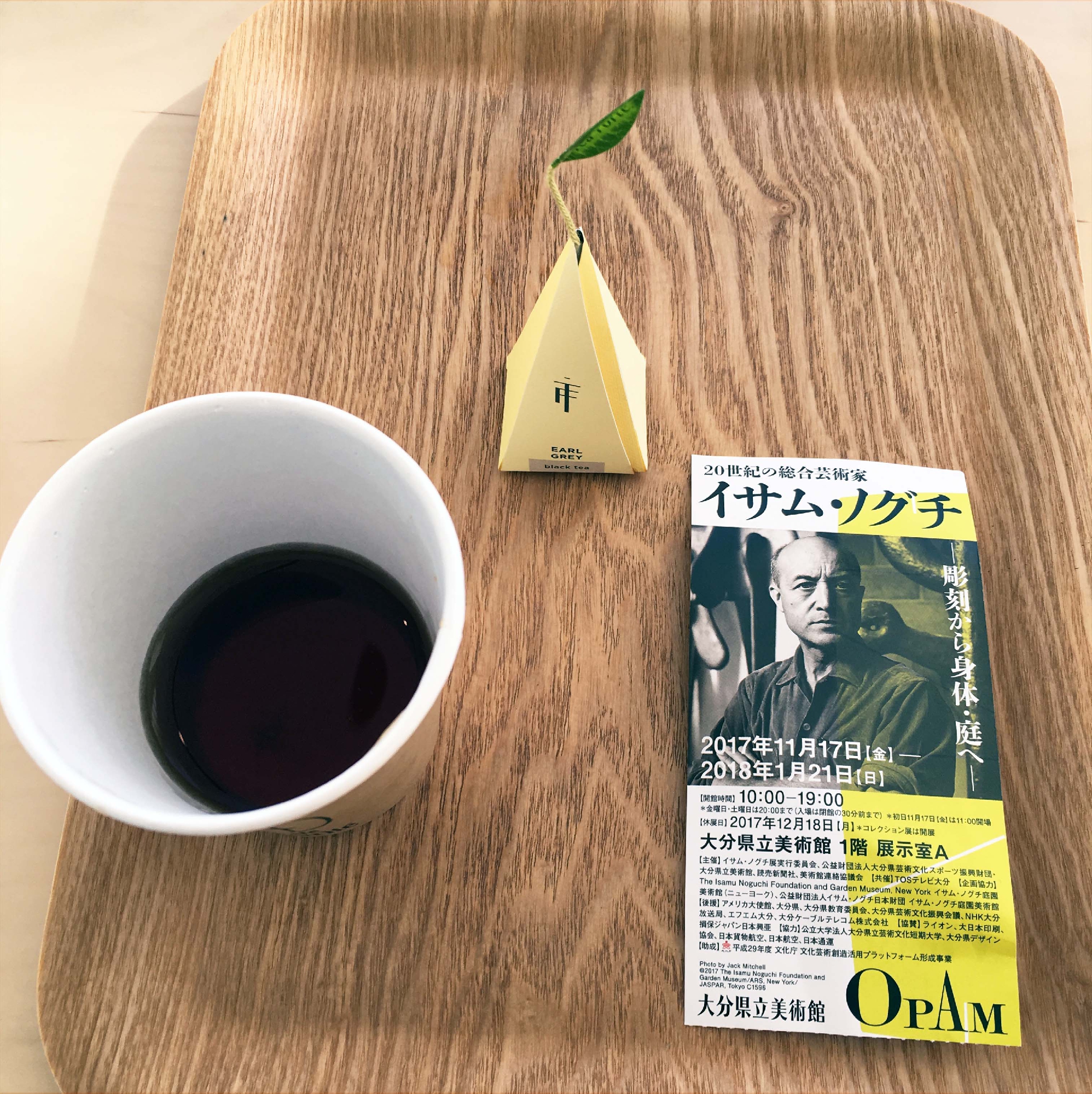 写真左から、イサムノグチの作品(一部写真可)。中、県立美術館で飲んだアールグレイとその容器とチケット。右、県立美術館での私。