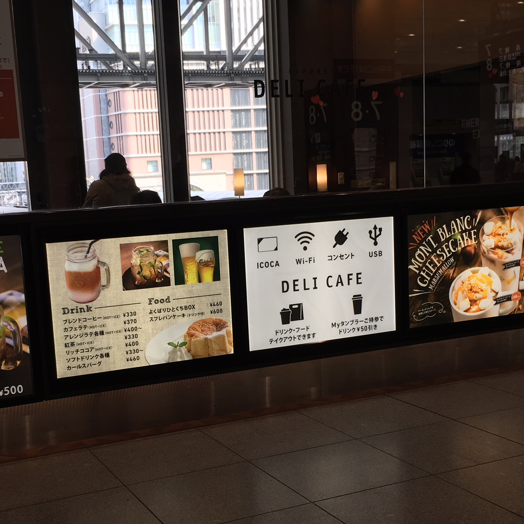 大阪駅構内で、写真1-42のようなカフェを見つけました。現代風でカッコイイナと思い思わず写真を撮りました。よく見ると、入口に手札型の大きさで同様のデザインのものが貼ってありました。詳細はサービスニュース参照。