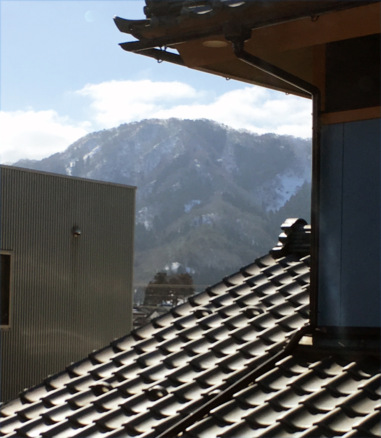 雪の福井・永平寺付近。雪で難儀をされている方には失礼な話なのですが、たまに訪れる身としては、「雪」は綺麗です。特に今日のように晴れた日は、格別です。研修中にふと外を見ると、軒の先に空と雲と山、変に幸せを感じたのですが、これは何なのでしょうか。写真3-10。