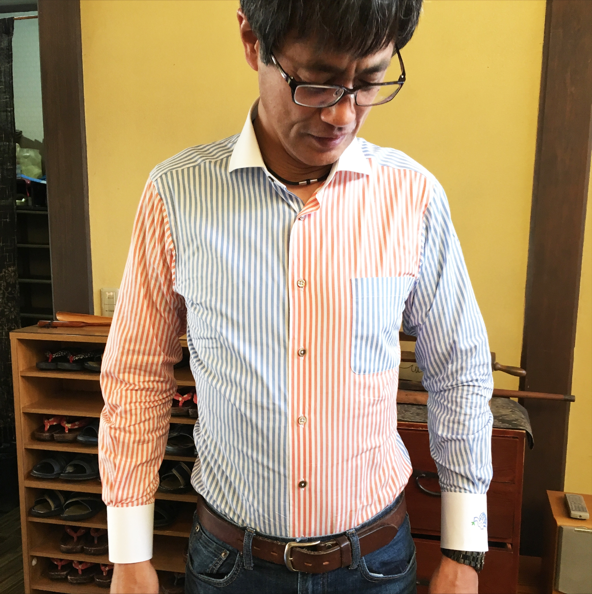 中村社長が、色違いのシャツ2枚を購入、組み合わせて作ったらこんなシャツが出来ました。と見せてくれました。作りは何の変哲も無いシャツですが、出来上がりはおもしろい図柄となっていました。写真3-1。