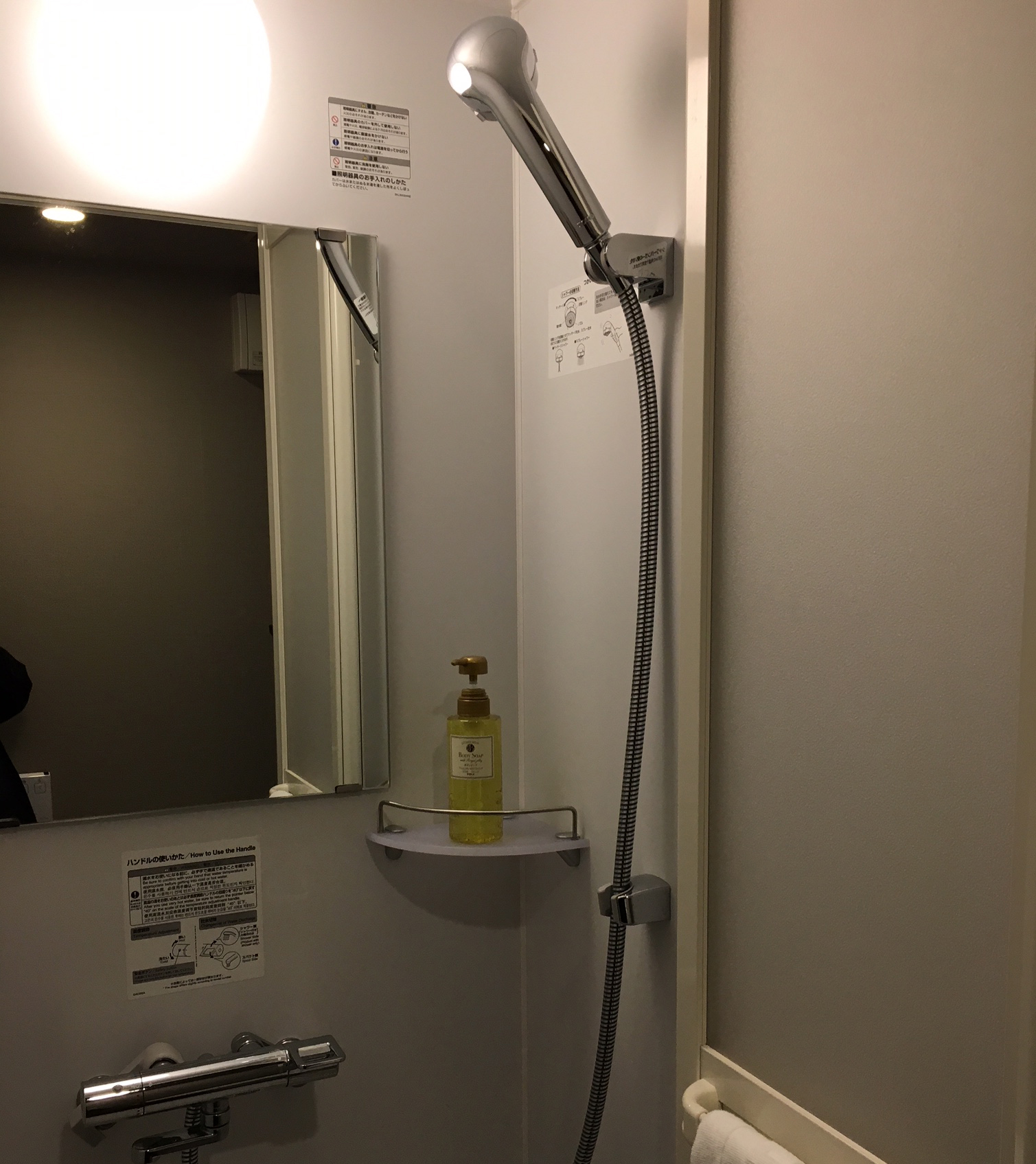 温泉大浴場が用意されているので、部屋はシャワー設備だけでしたが、「大浴場は混み合っていますのでお時間を見計らって」といわれては、バスが欲しいと感じました。写真3-17。
