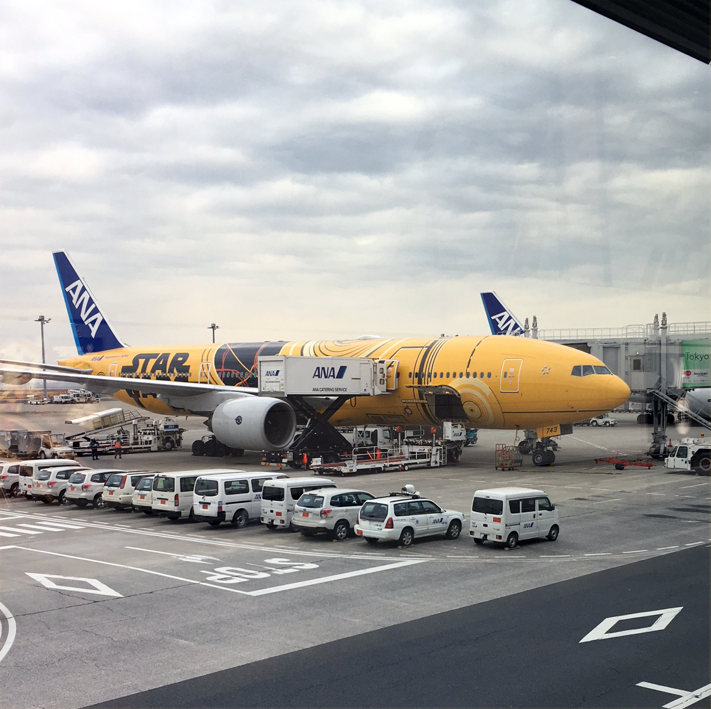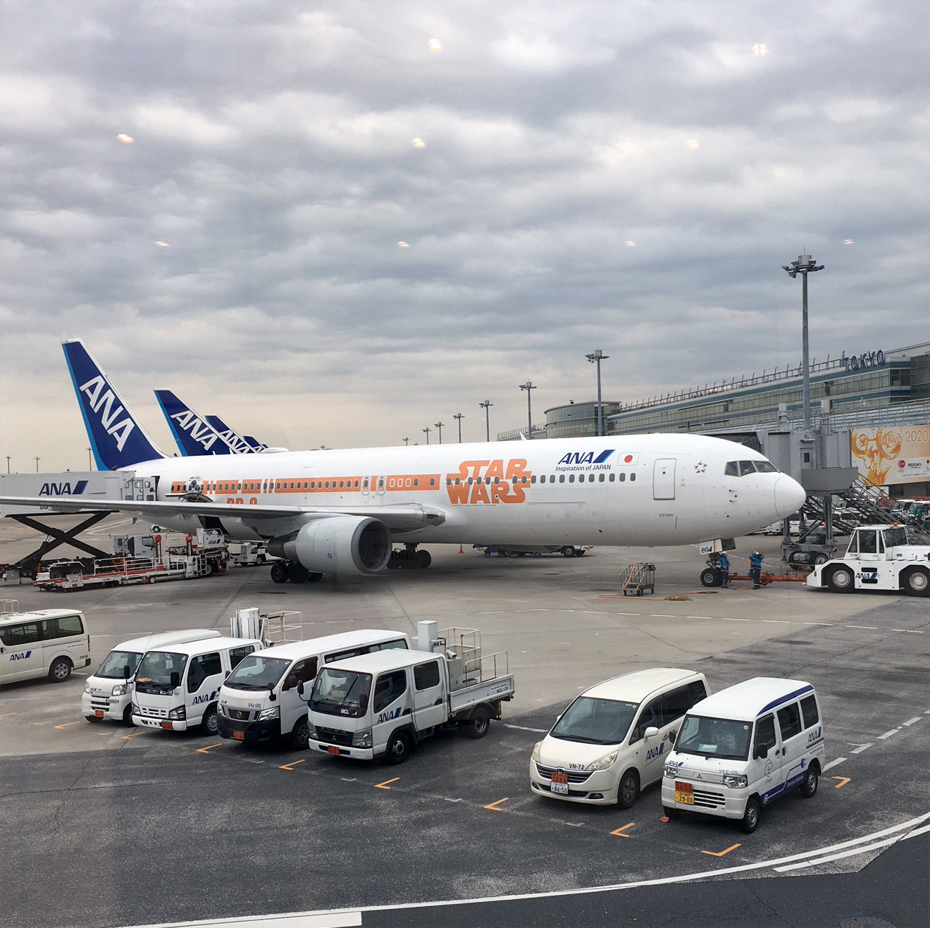 羽田で、STAR WARSの異なる図柄の飛行機を見ました。前に、ラウンジに展示されていた模型飛行機と写真を並べようと探したのですが、分かりませんでした。仕方なく、以前の「ポケモンジェット」を並べて見ました。