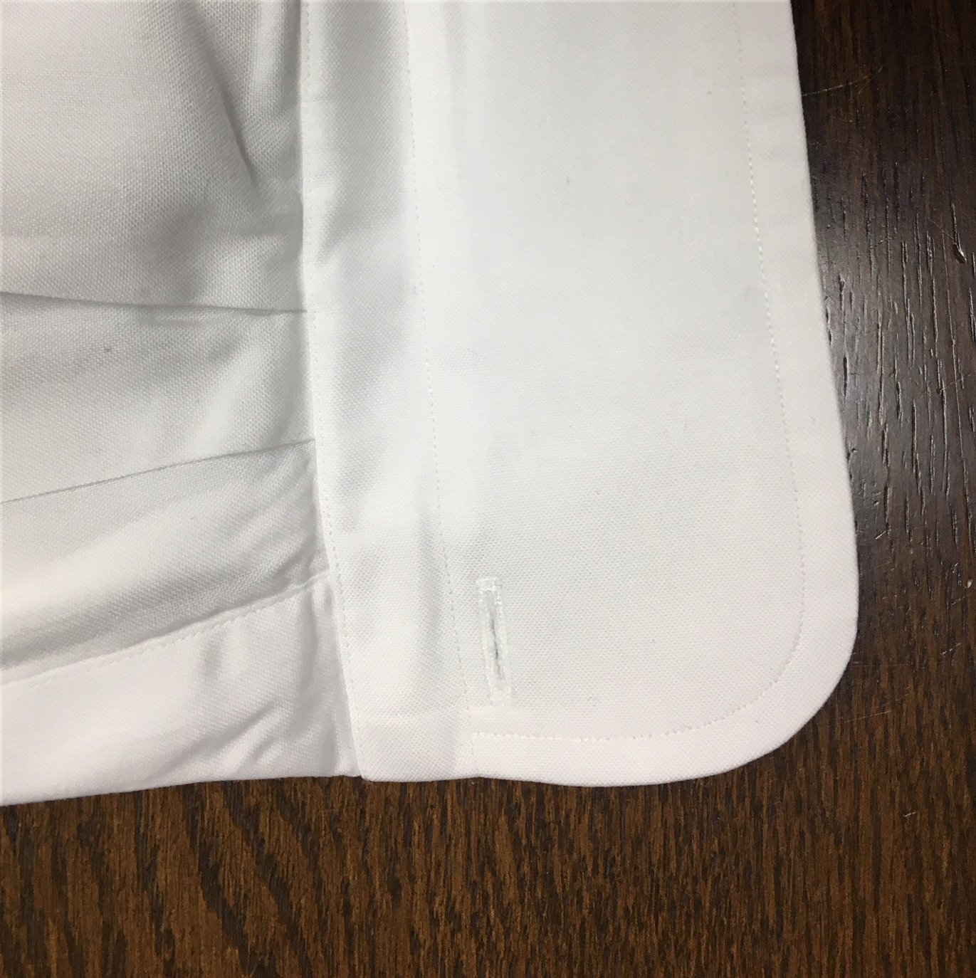 写真3-7は、袖をたたむ時のカフスの置く位置が悪く、右カフスの部分が折れてたたまれてしまいました。写真3-8は、左カフスの拡大写真です。