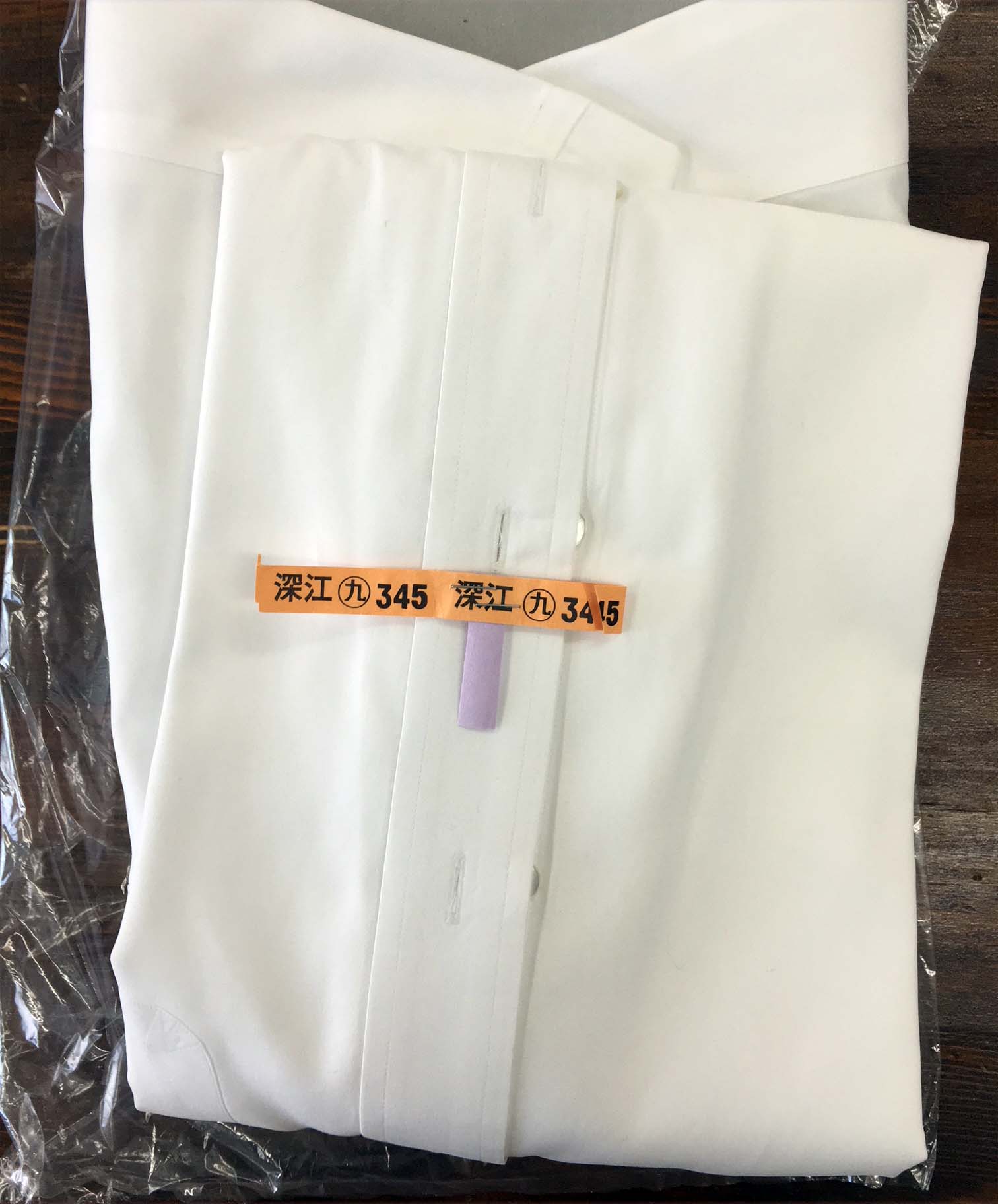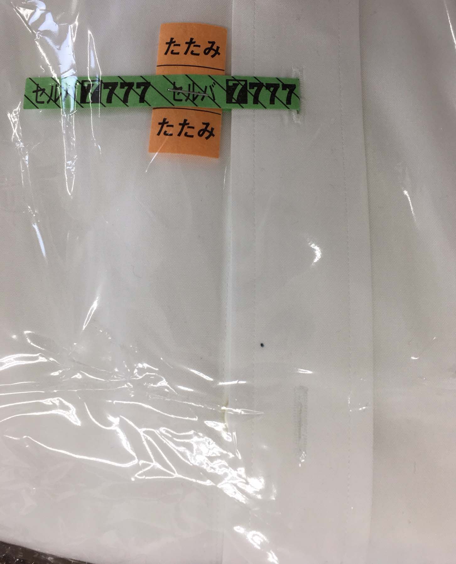 クリーニングテストのシャツが4枚上がってきたので、計測を行いました。包装紙の上から見て、あまりにヒドイ状態の商品(写真5-16,17)、ホコリの付いた商品がありました。ヒドイ状態は、配送中のものと思われますが、いくら忙しくなったからと云っても注意が足りないのでは無いですか。ホコリは、前立ての真ん中(写真5-18)、これは目に付きました。