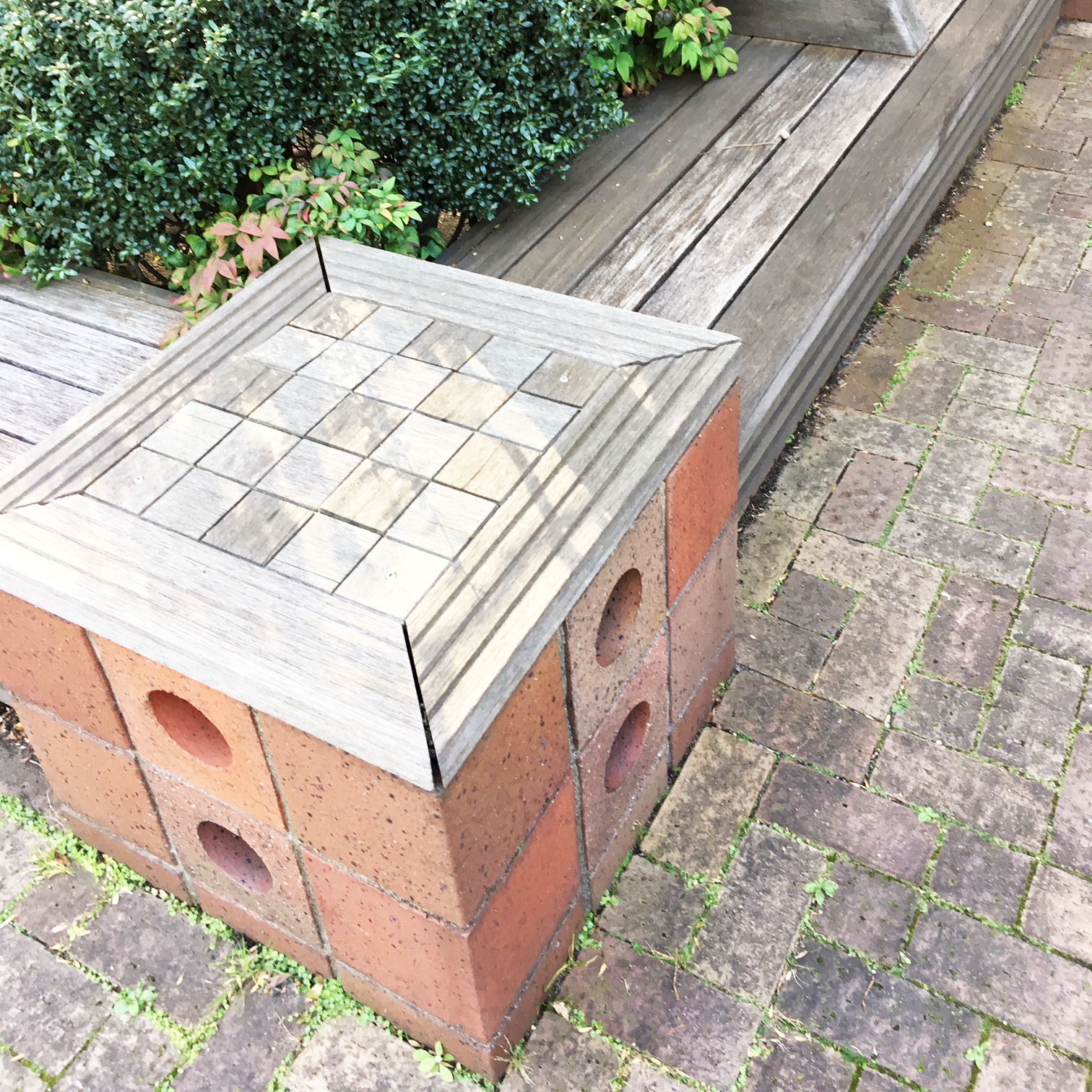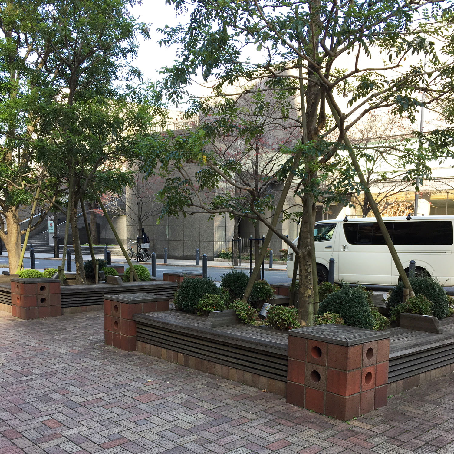 ホテル・メトロポリタンエドモントから出かけるのに、いつもと反対側の出口を利用しました。外に出ると、木々の周りに腰掛ける場所が作られていてこれがよく見ると石煉瓦と木製なのです。隣の建物と全体の雰囲気がいわゆるコンクリート作りとは異なって、味があります。