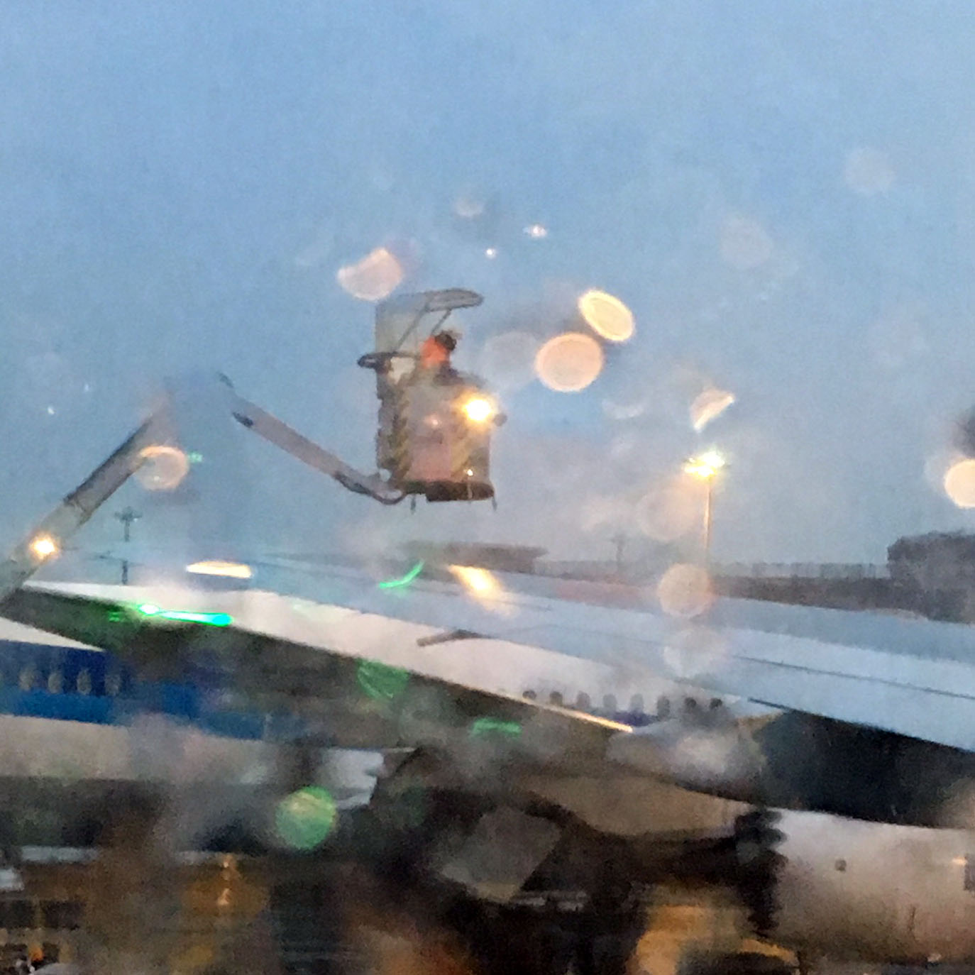 飛行機に乗り込んだら「翼の雪を除去しますので、この作業が終わり次第フライトします」とアナウンスがありました。窓の外を見ると、クレーンに乗った人が、水を噴霧して雪を除去しているようでした。(写真13、窓の水滴が邪魔して綺麗に撮せませんでした)