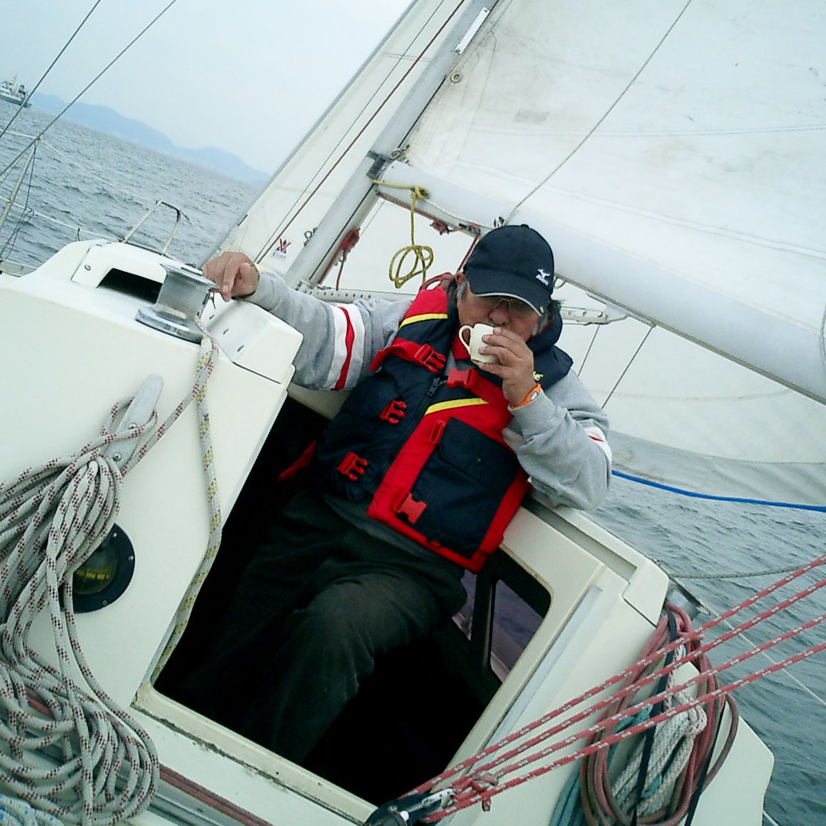 昨年、飛行機の中から撮した翼、写真16-1。昔、ヨット二艇で、西宮~洲本にセーリングに出たときの写真、写っているのは私と新阜氏、撮影は松居氏、写真16-2。ヒールしているヨットで一杯飲んでいる私、撮影は米谷氏、写真16-3。 結局一番綺麗に取れてる写真(翼)に決めました。