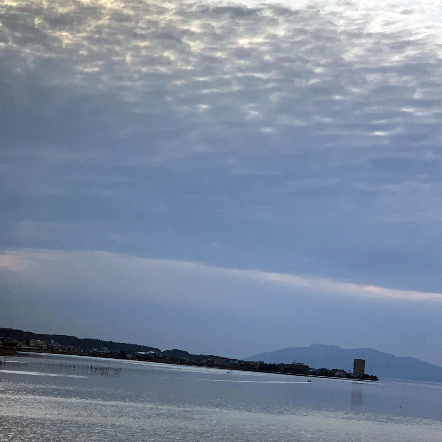 写真18は、この日の大山。写真19-1、車窓からの雰囲気のある大山。写真18-2は、薄暮の宍道湖。 18-3は、晩の食事、呉竹寿司の刺身の盛り合わせ。
