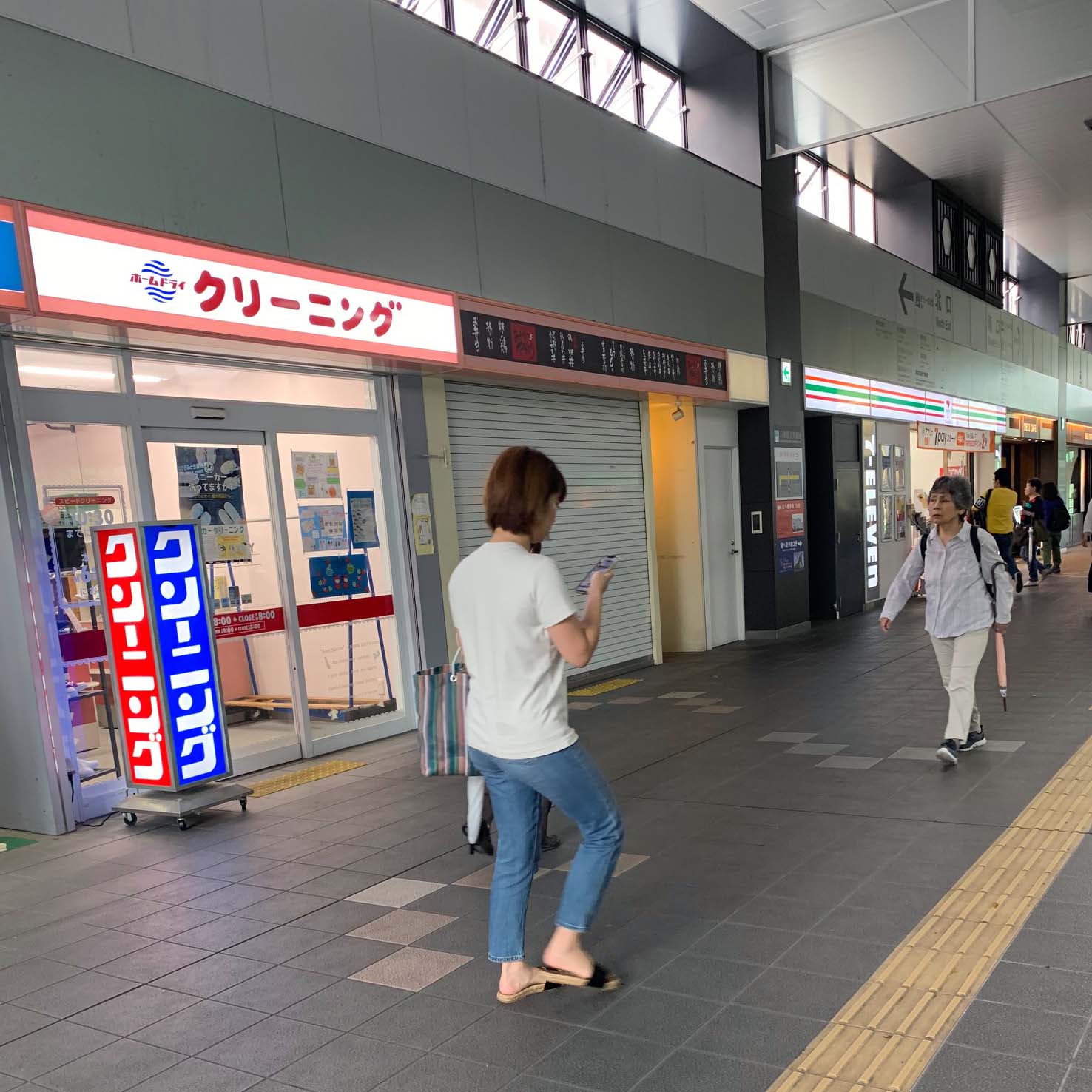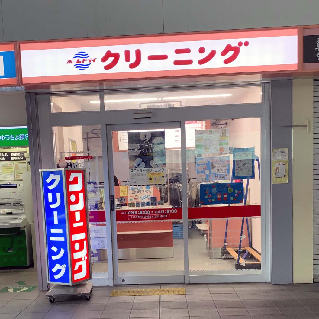 灘駅でホームドライの店舗を見ました。キレイにまとまっていますが、ガラス面にチラシが貼られていて減点です。写真1-1,1-2。