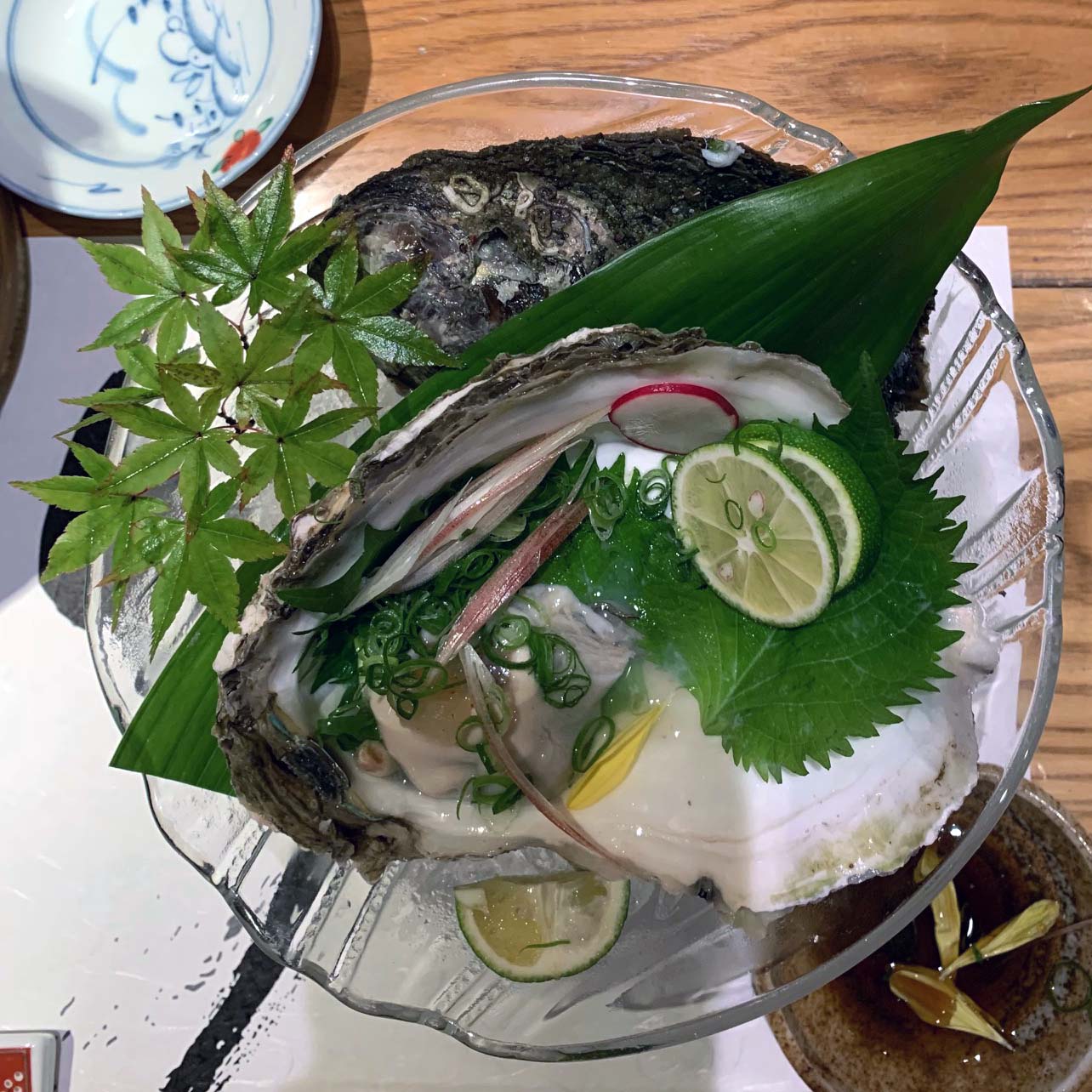 〔晩の食事〕竹寿司(岩牡蠣、縞鰺のお造り、鯛のあら煮。握り・小鰭、縞 鰺、烏賊)
