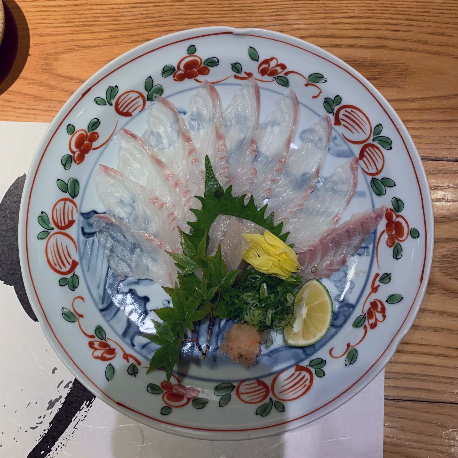 〔晩の食事〕「〆張り鶴」、フグの煮こごり、鳥取の岩牡蠣、・・・の薄作り、にぎり寿司・小鰭、鰺、中トロ。