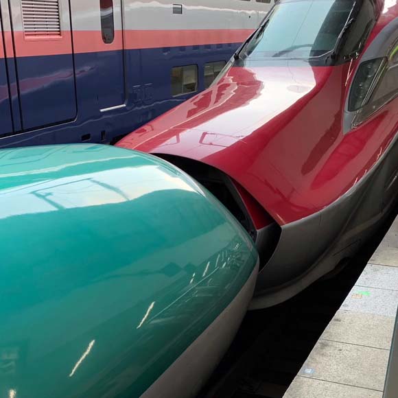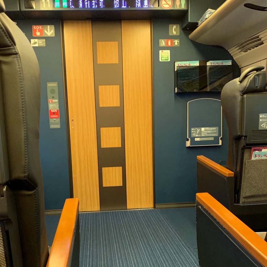 列車がキスしているように見えたのは私だけ。写真22-1。車内は木(無論国産の木だと思いますが)をふんだんに使った落ちついた雰囲気がありました。写真22-2,22-3。