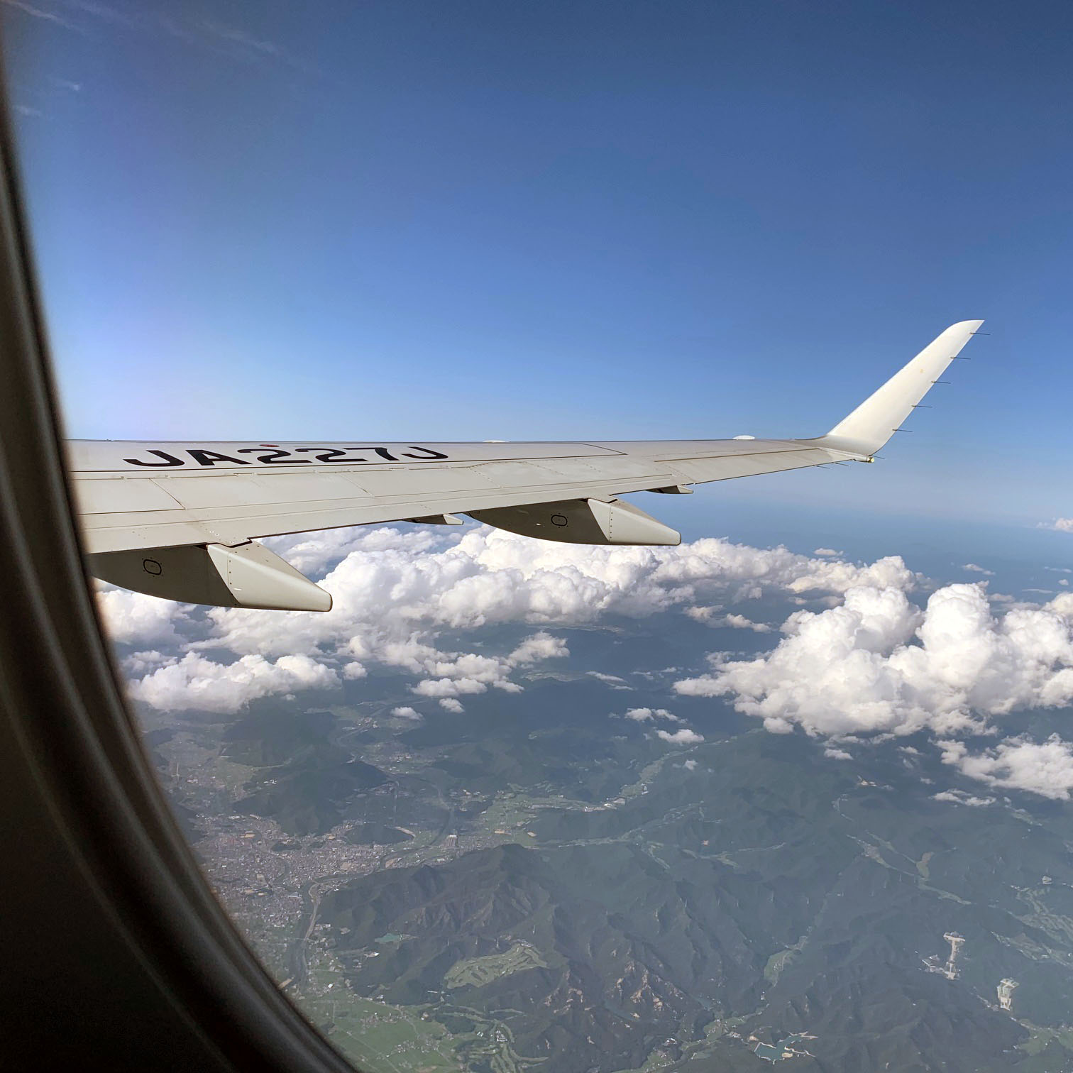 今日は雨が降ると言われていました。伊丹空港を飛び立つときは、薄曇り、視界は霧が掛かったような状態でした。