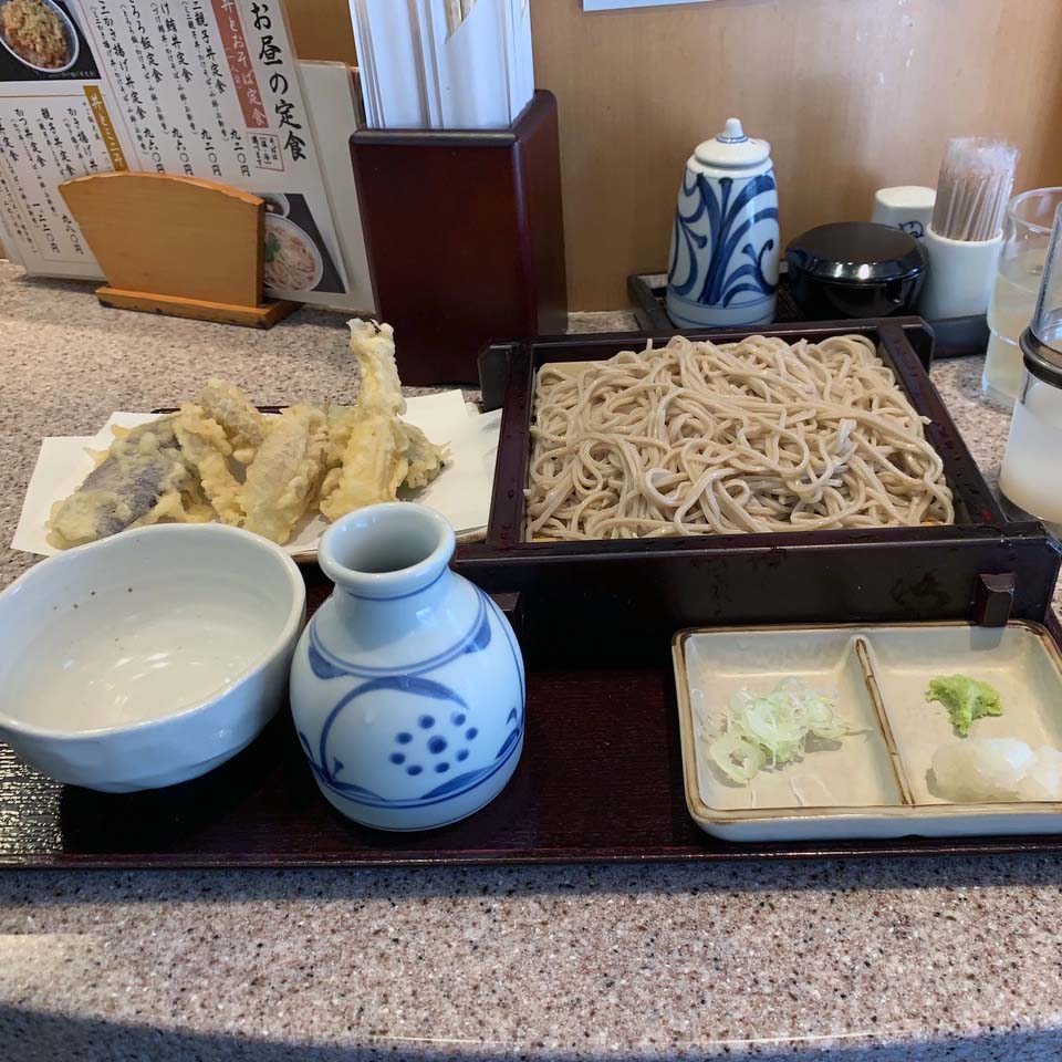 〔晩の食事〕雪村蕎麦(天ぷら、平目の刺身、ほうれん草のおひたし)。 お酒;焼酎水割り4杯。