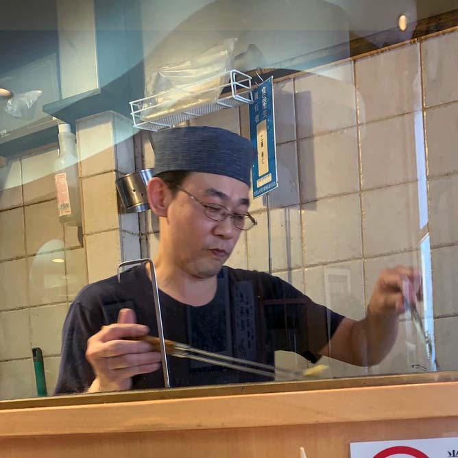 写真4-1は,笑庵の「野菜天ざる」。蕎麦は2・8、天ぷらは揚げたて。写真4-2は、天ぷらを揚げる店主。注文して店内を見回していると「韃靼そば」のチラシがありました。気づくのが遅すぎました。