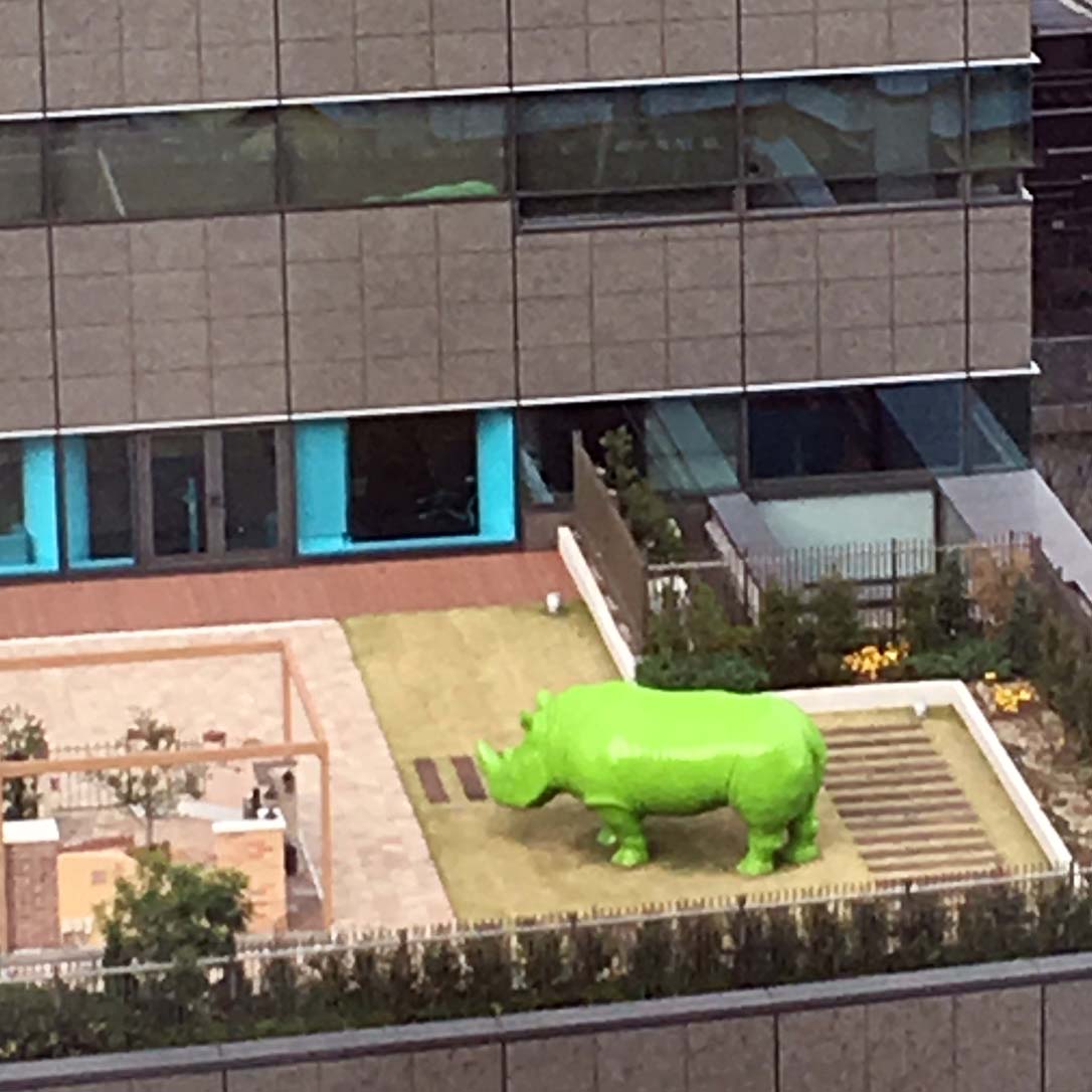 写真12-3は、ホテルの上から隣のビルの屋上に不思議なものを見つけました。オフィスビルと思われる屋上にカバ?と思って撮しました。