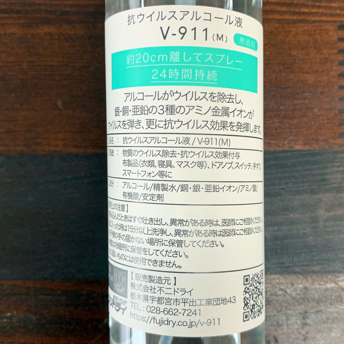 V911(M)は、クリーニングで衣服に加工されている薬剤を、アルコールで希釈し使えるようにしたものです。