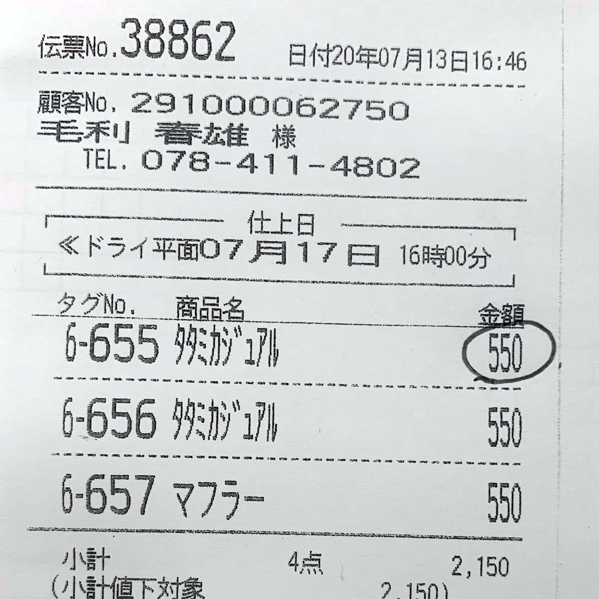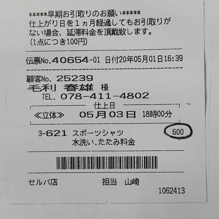 しかしある日、「水でお願いします」と言ったら、1,100円と言われ(写真27-5)、「いつ出来ますか?」と聞いたら一週間かかると言われました。戻って、前回の伝票を見ると「水洗い・たたみ、600円」(写真27-6)とありました。