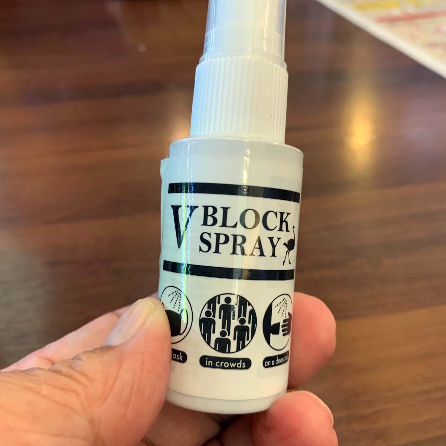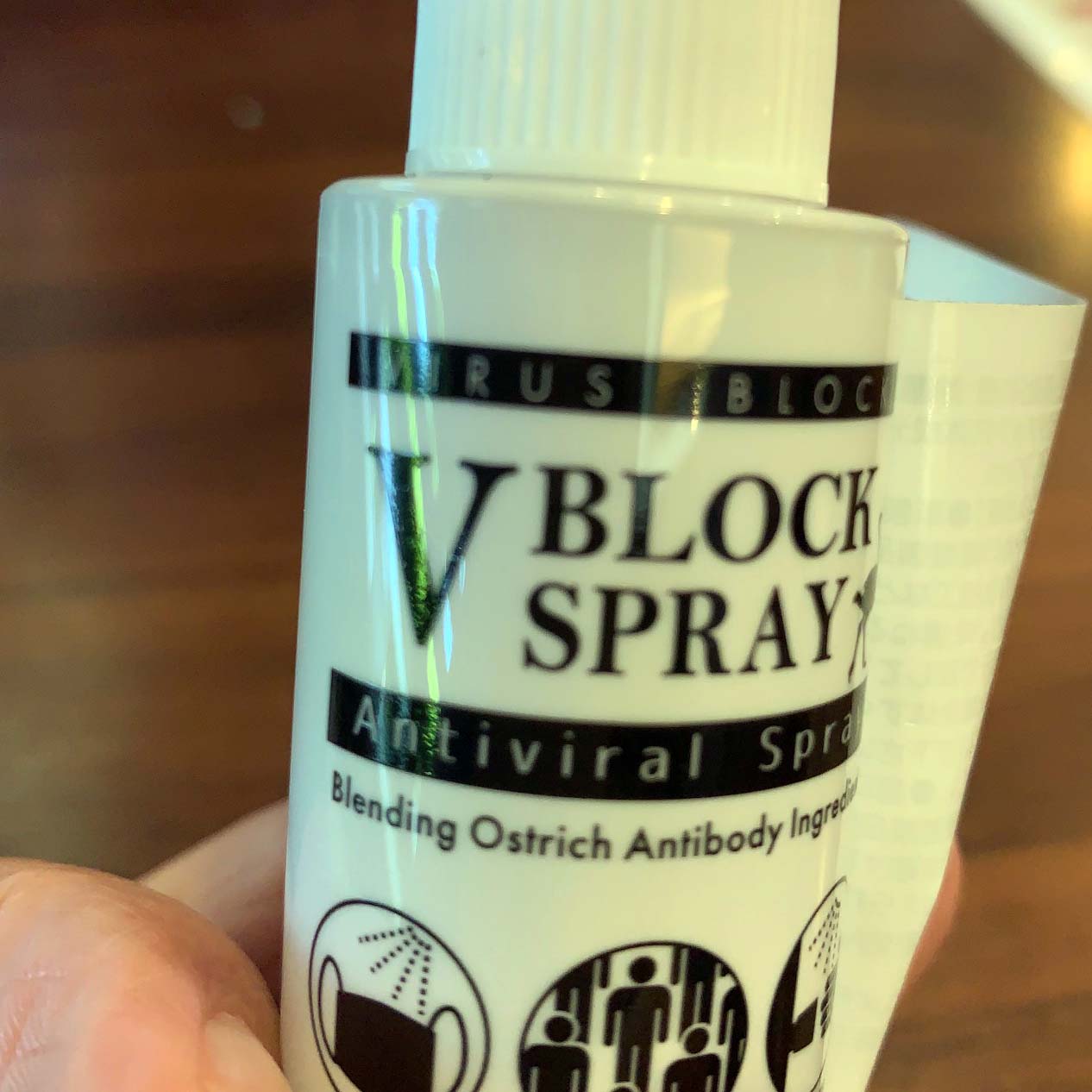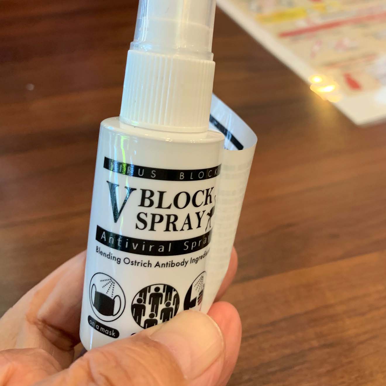 皆で、お昼を食べにいきました。その時、ダチョウの卵で作られる花粉症の抗体、「V BLOK SPRAY」を見せられました(写真8-1)。そして、容器のシールを剥がして見せてくれました(写真8-2)。容器の一番上の黒帯の中に白文字で「VIRUS BLOCK」と書いてあります(写真8-3)。