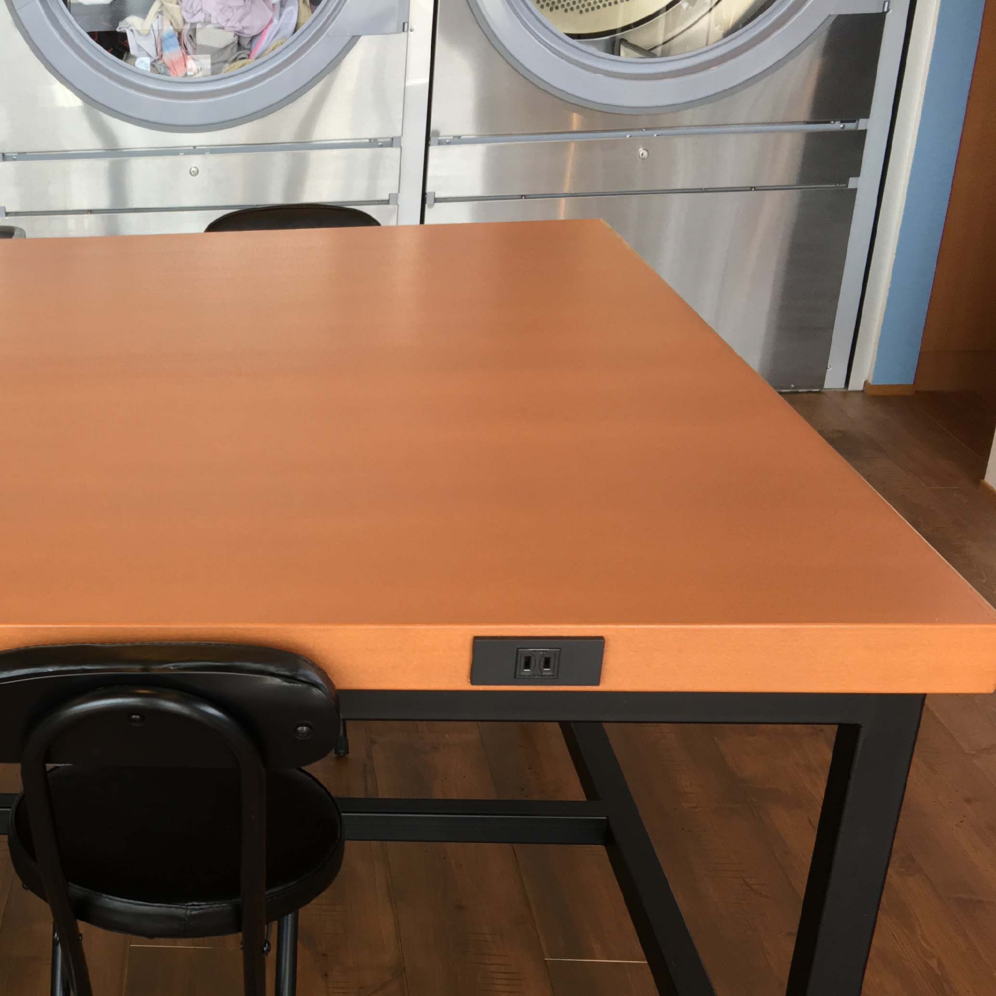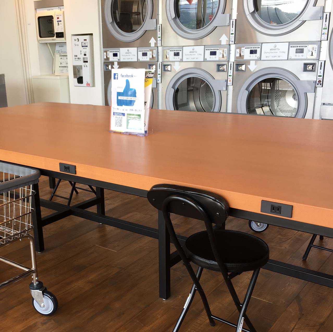 こんな中、コインランドリー(Wash & Fold)のタタミ台にコンセントが付いているのを見つけました。