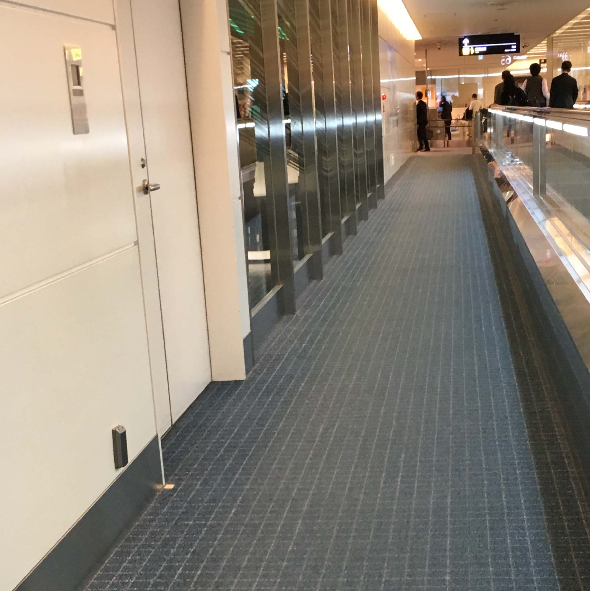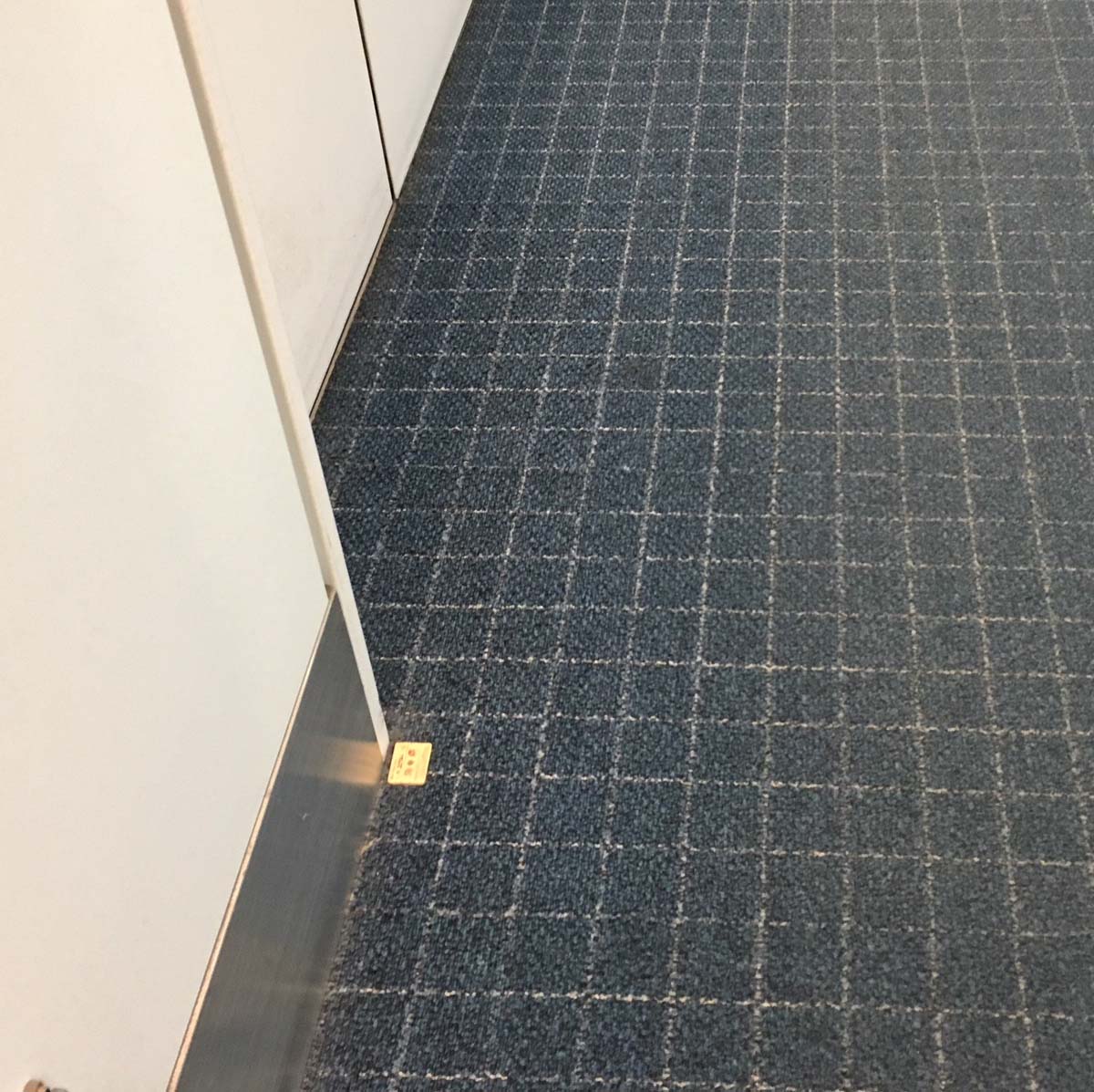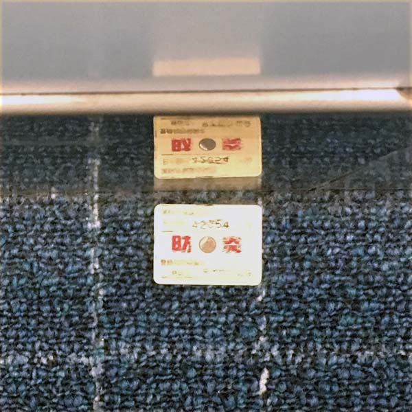 羽田空港の到着出口への通路を歩いていたら隅っこにシールが、「なに」と近寄ってみたら「防炎加工証」でした。写真2-10,写真2-11