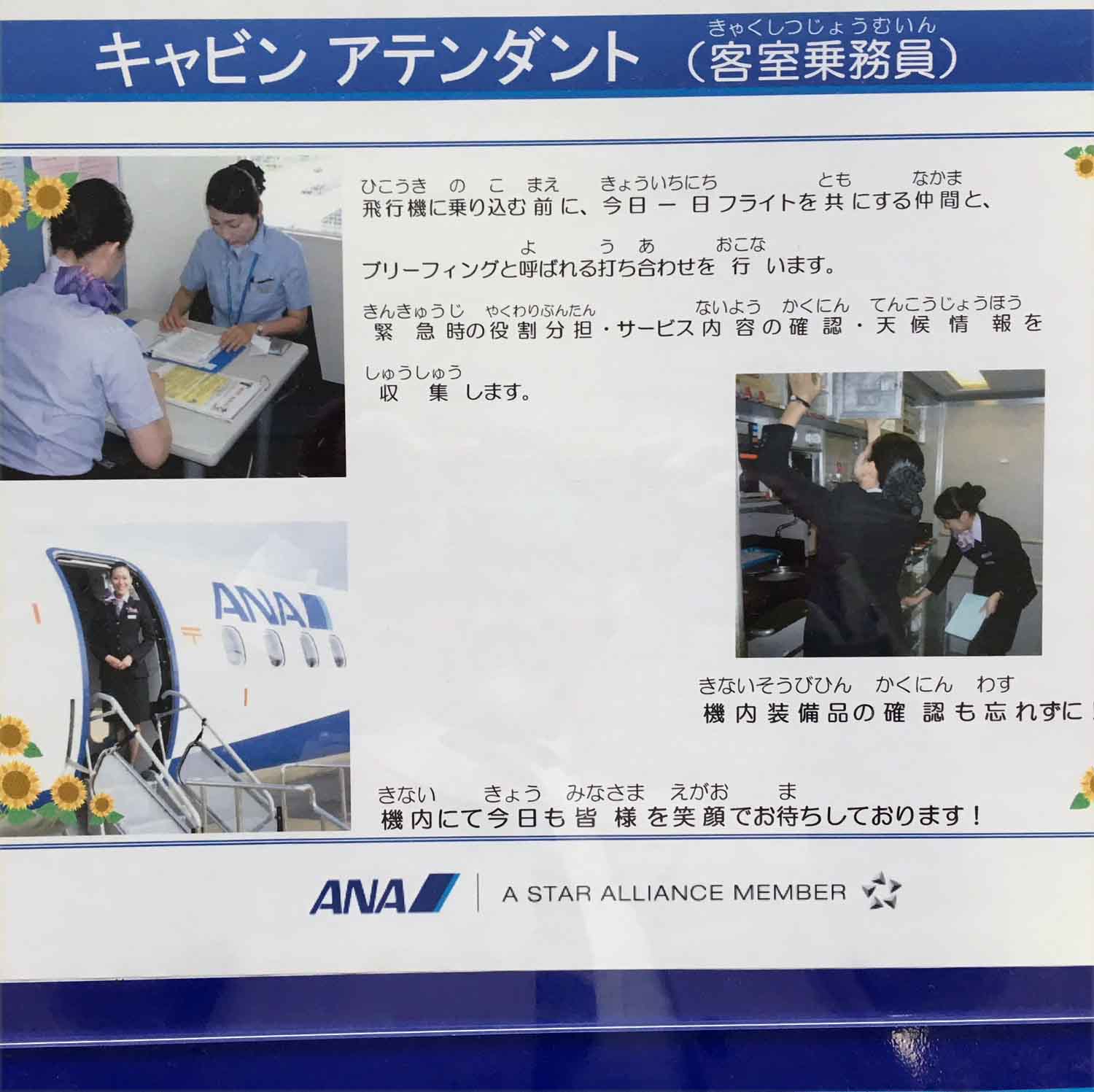 空港の構内ロビーで、ANAの飛行機に携わっている人々の写真を見ました。写真2-1