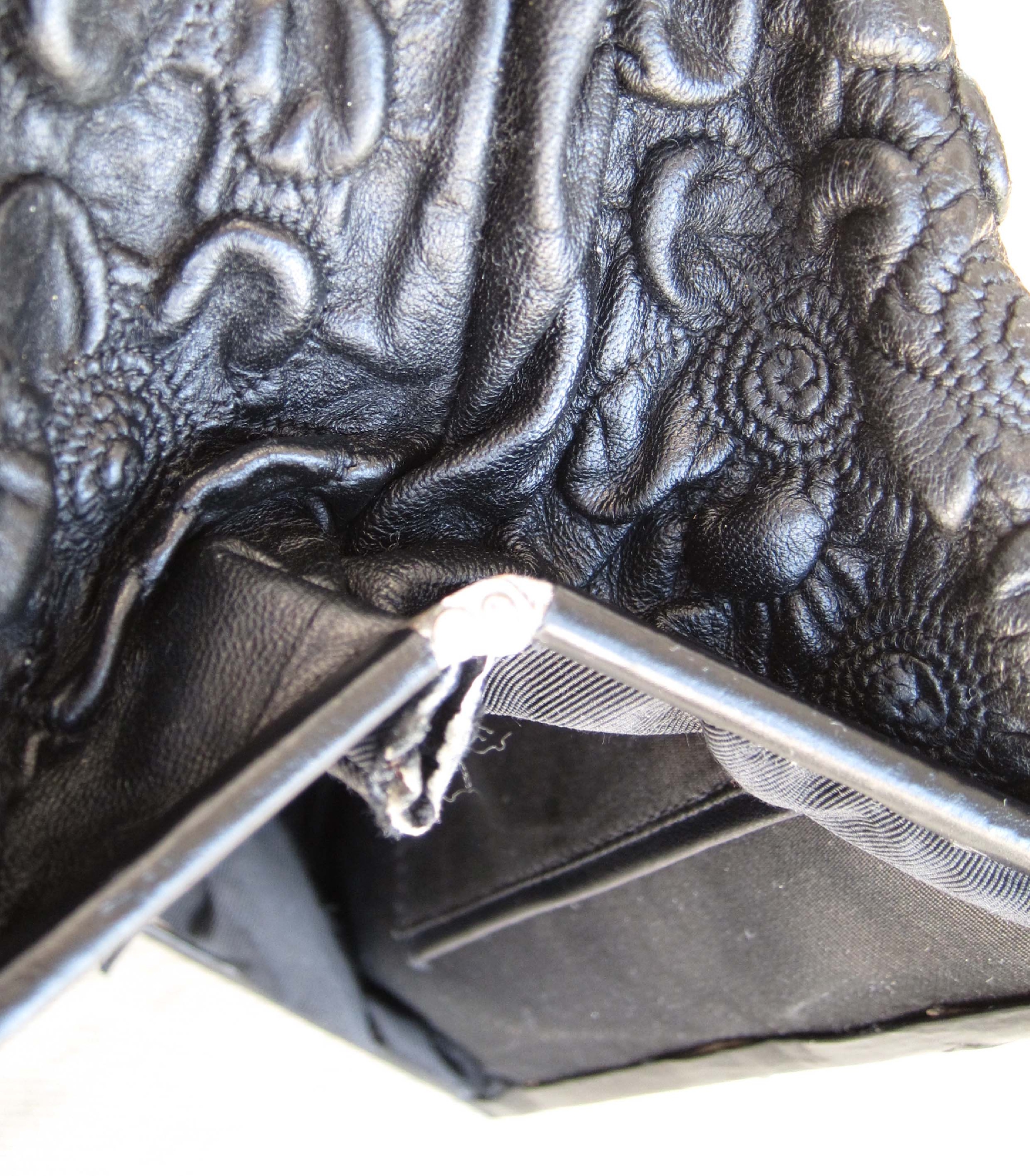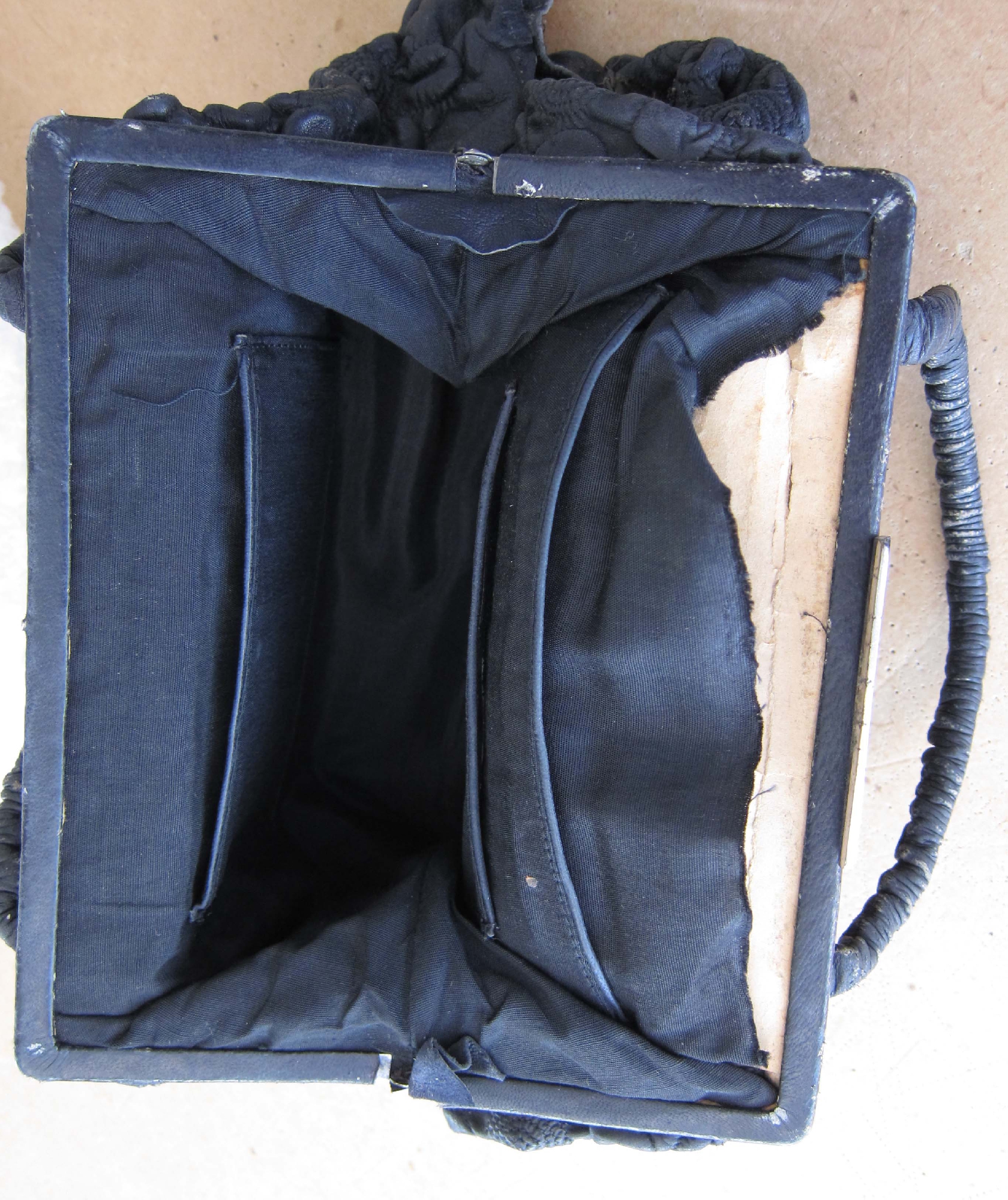 祖母、母親と大切に使ったのでしょうが、全体のつやは無くなり(写真2-9)、角は刷れて破損(写真2-11)、内側は破れて芯がむき出し(写真2-10)になった見るも無惨な形になりました。