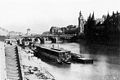 ・・前略・・それ(洗濯船)は、文字通り、セーヌの土手に係留された屋根つき平底船で、船縁に沿って洗濯台とベンチがずらりと並べられ、小柱で区画に区切られていた。自宅から汚れ物をかついできた女たちは船主にいくばくかの金を払って区画を借り切ると、そこで汚れ物をセーヌの水に浸け、布地に灰をふりかけてから、これを棒でバンバンとたたくのである。 同じセーヌの土手でも、日当たりがいい右岸に洗濯船は集中していた。パリに初めて洗濯船が登場したのは15世紀の終わり頃である。それ以前には、パリ市民はセーヌの土手で直接、洗濯を行っていた。しかし、市立病院の排水で衛生状態がよくないところでも作業を始める者が後をたたなかったので、パリ市当局は、この新発明が登場すると、洗濯場の局地化が可能になると歓迎した。民衆たちも、雨風にさらされずに洗濯ができると喜んだ。・・・後略。(ウィキペディアより) |