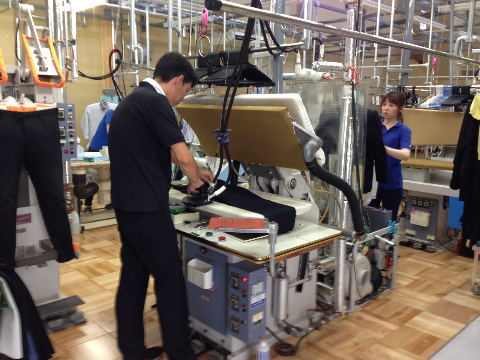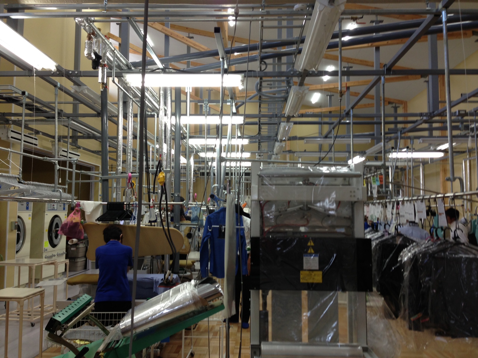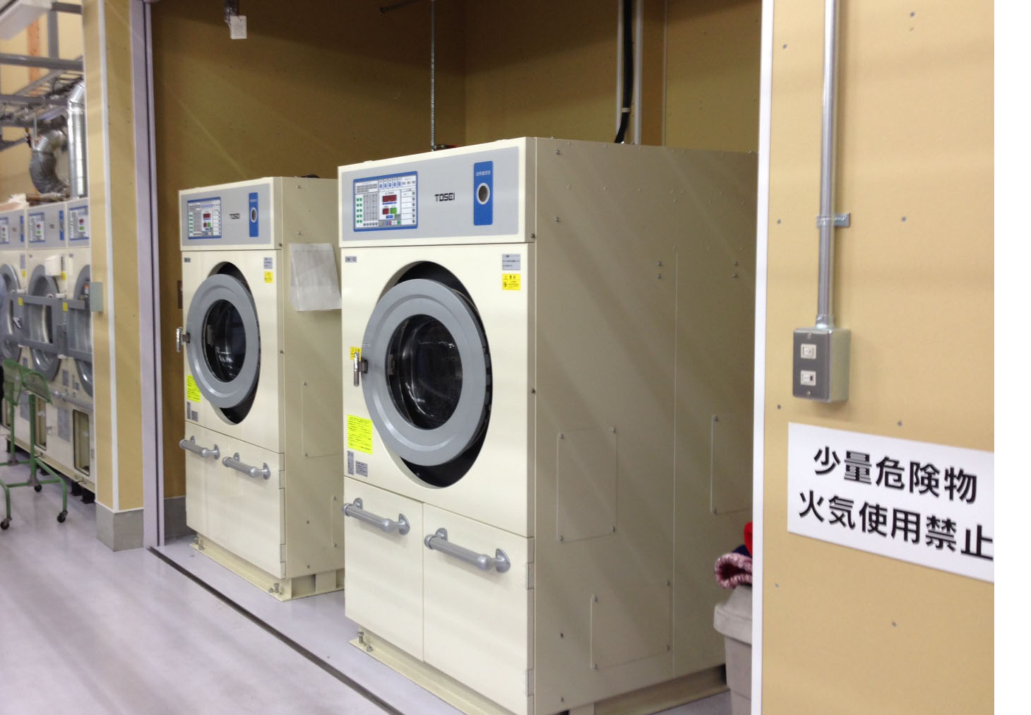 床は、ドライ機、乾燥機、ワッシャーの周辺を除き、木をタイル状に敷き詰め、見た目も美しく、足元の感触は「やさしい」ものでした。