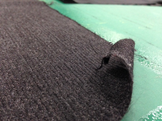 また、水に触れるとこのようになる生地があると、布の片側に収縮(丸まる、写真1-5)例や、布の表面がぶくつく(写真1-6)実験例を見せていただきました。また、接着芯地が剥離するクレーム商品がありました。(基本的には戻すことは出来ないと言われてました)