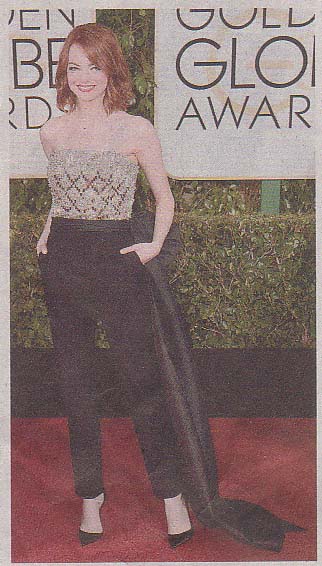 ゴールデングローブ賞のジュリアン・ムーアはジバンシィの黒地に銀色のスパンコールのドレス、ケイト・ハドソンは白を基調のアトリエ・ベルサーチ、エマ・ストーンはランバンのパンツでした。