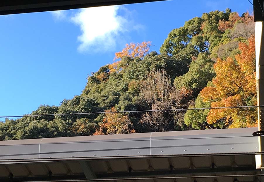 新幹線ホームの屋根とその上の紅葉、青空と雲。一瞬寒さを忘れ見とれてしまいました。新神戸駅の裏の山は、六甲山系再度山(ふたたびさん)に繫がるもので、急斜面となっています。この山は、多くの落葉樹が紅葉を見せてくれます。