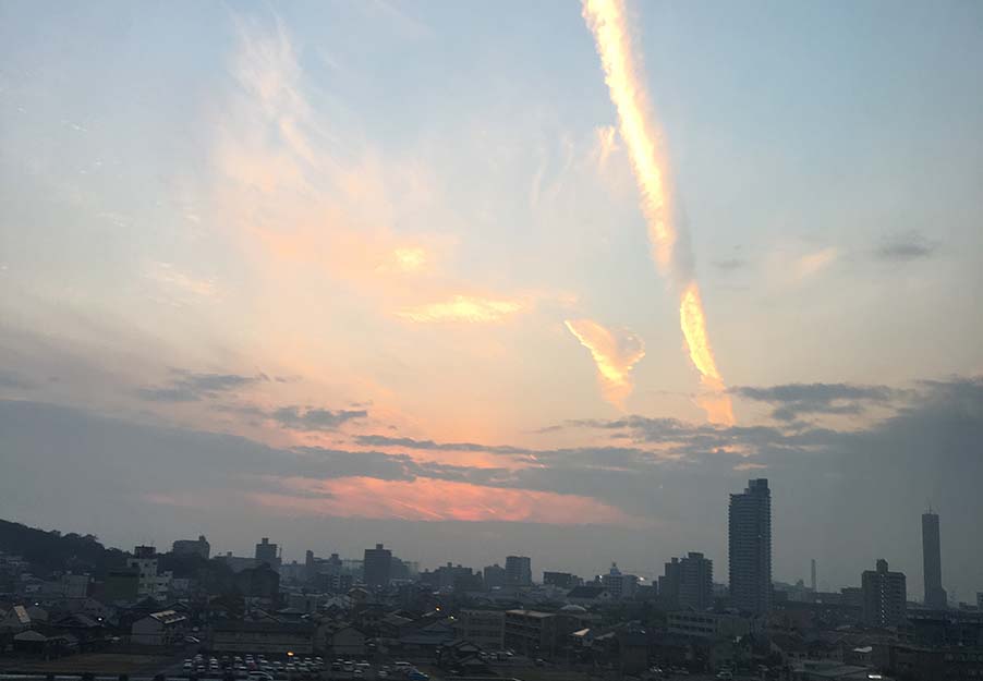 夕暮れの街に、夕焼けと白い飛行機雲。哀しいという表現では言い表せないのですが、しばらく見とれていました。