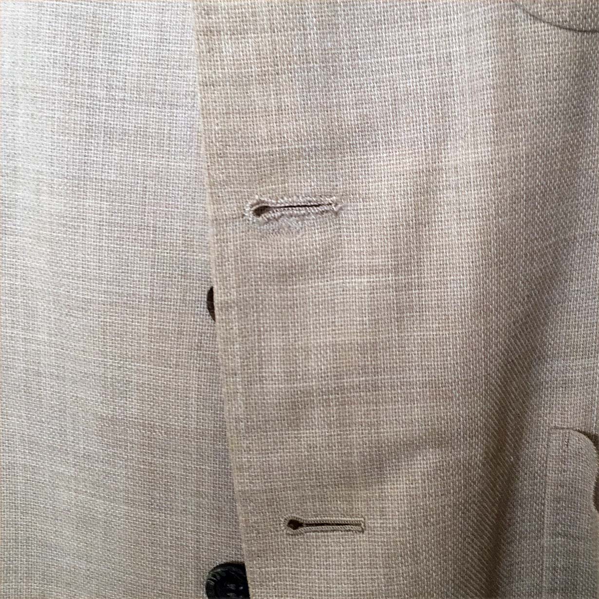 一番大きなのは上着の裏生地の損傷で、袖口、脇の下、裾が破れてきました。他には、ボタンホールの損傷、衿の折り返しの緩み、袖口の擦れ等があります。