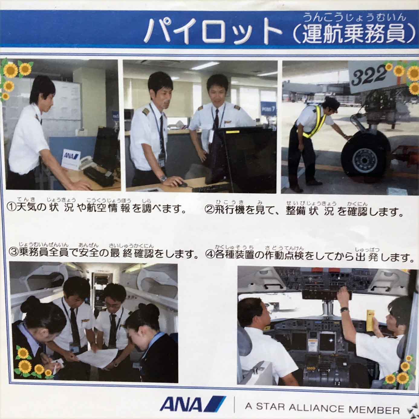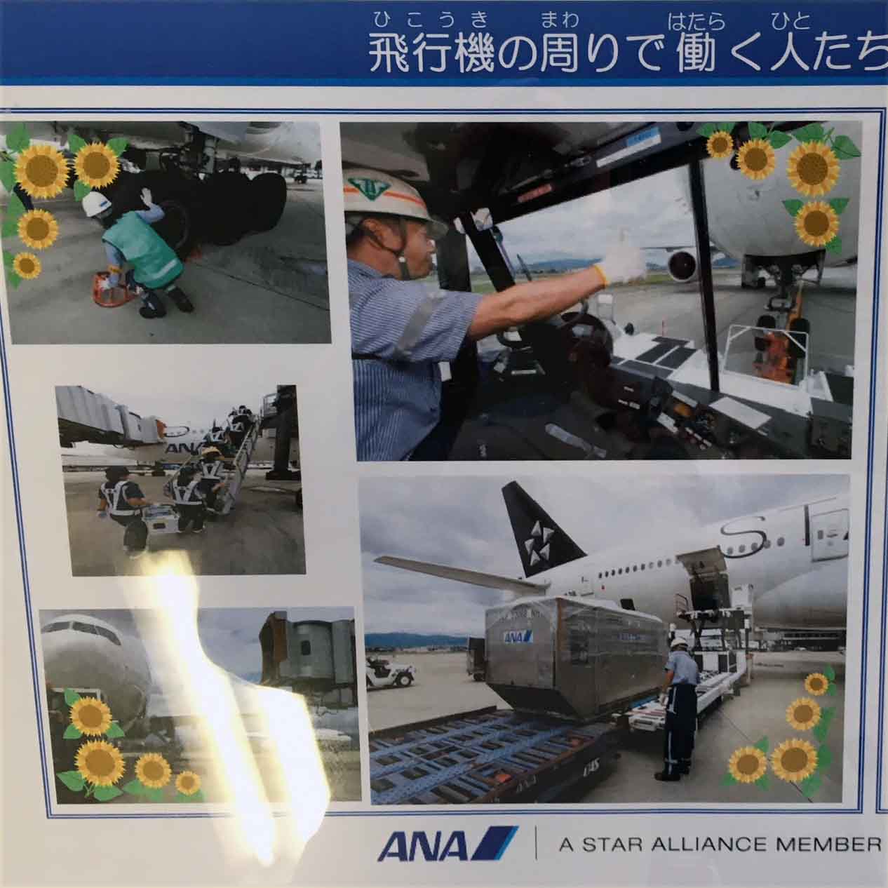 空港の構内ロビーで、ANAの飛行機に携わっている人々の写真を見ました。写真2-1