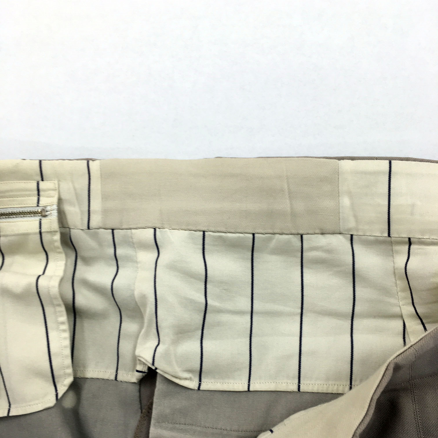写真2-13は、ズボンの腰裏の破損部分を他の布(縦縞の布が元の布、 無地の布が補修に使われた布)で補修した状態。