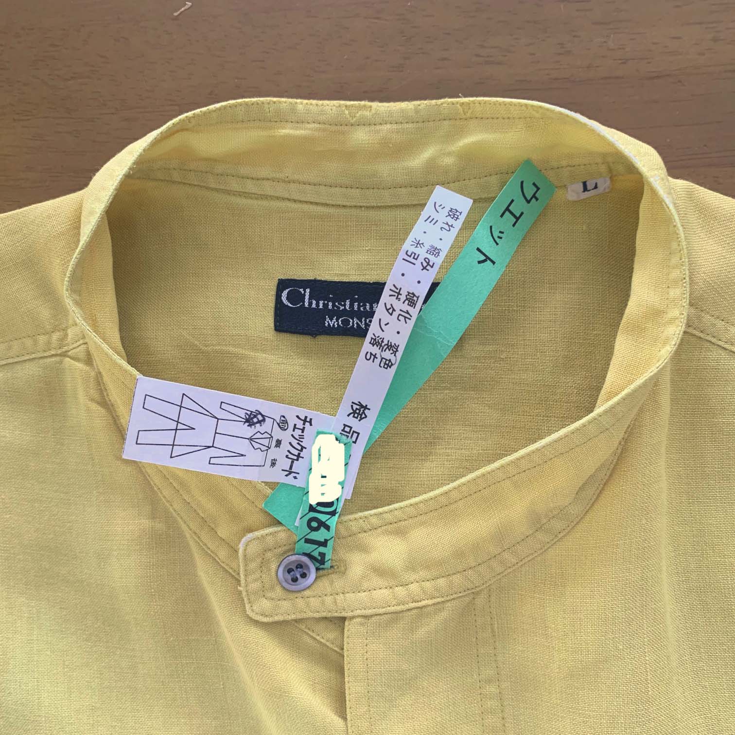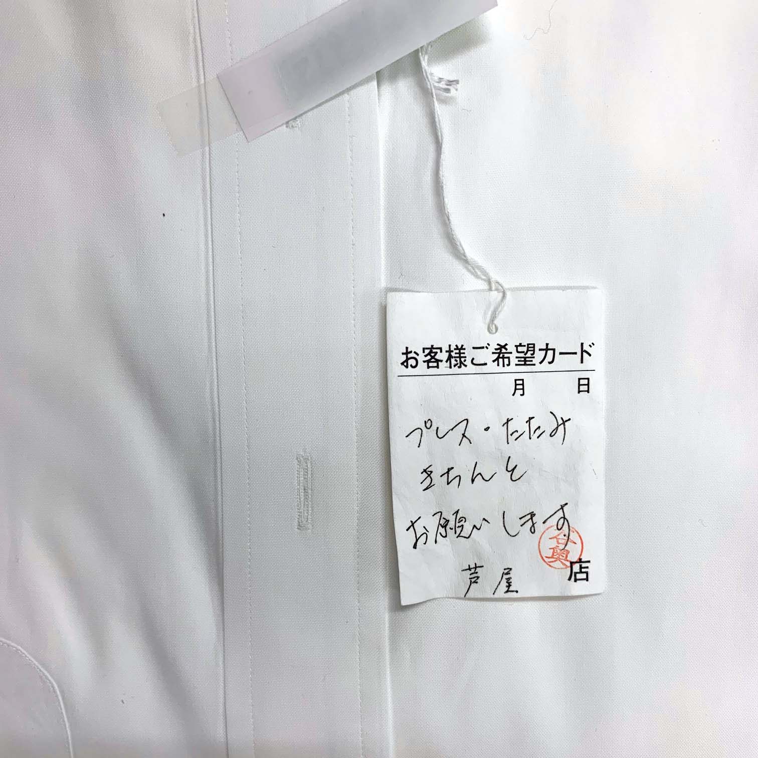 ワイシャツに付けられたタグ「プレス・たたみ きちんとお願いします」とあります。明らかにカウンターが万が一のことが無いようにと、わざわざ付けたタグです。