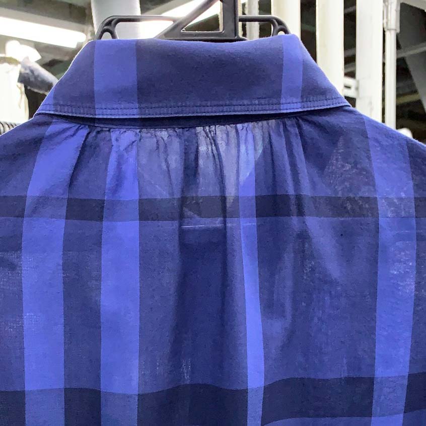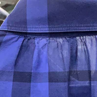 写真は、シャツを順に拡大したものです。エリはきちんと折られていない、背中に汗ジミが見えている、生地の着シワがそのまま残っている、縫製の問題もあるのかも知れませんが、シャツをドライした典型的な例と言えます。
