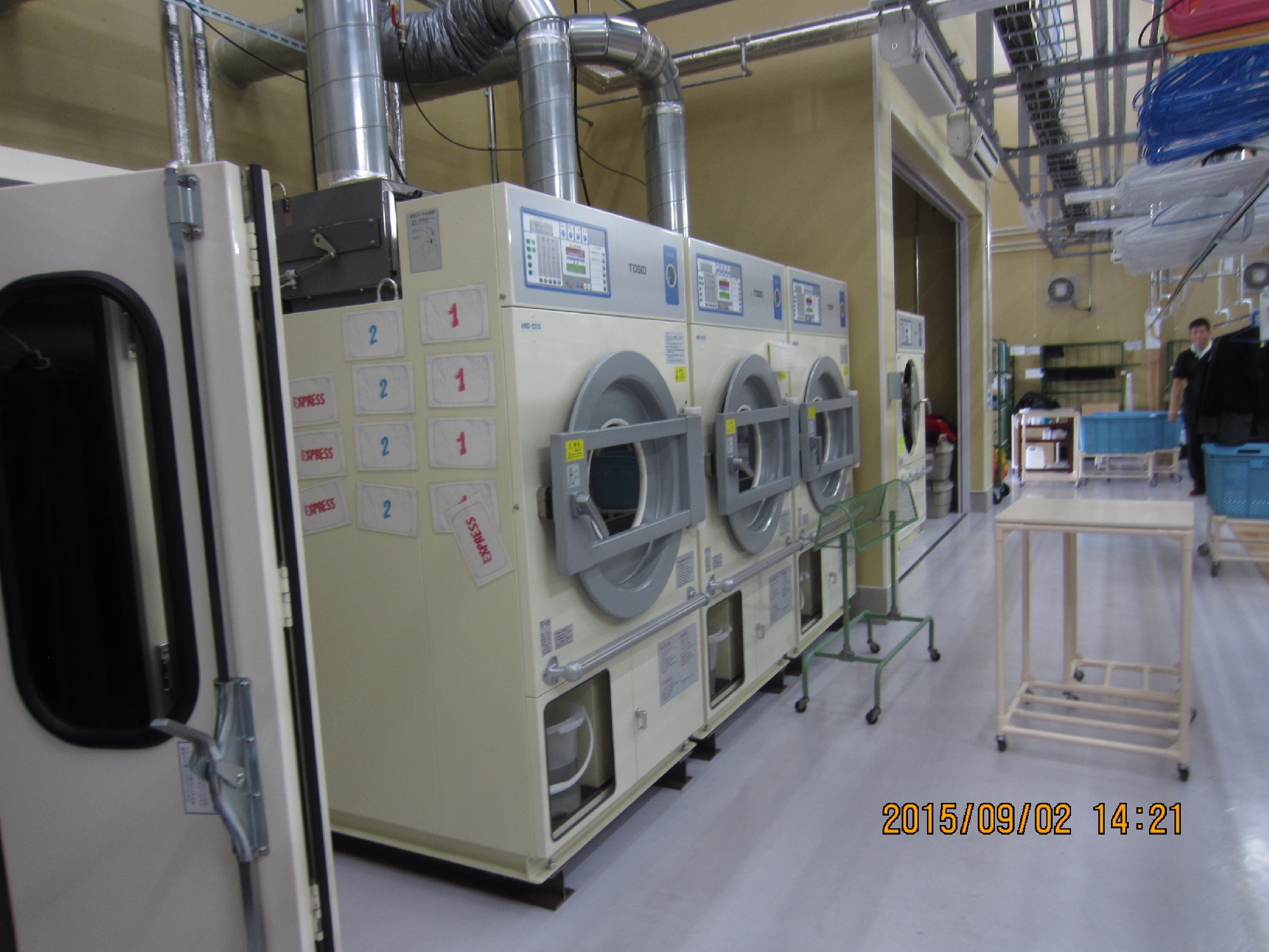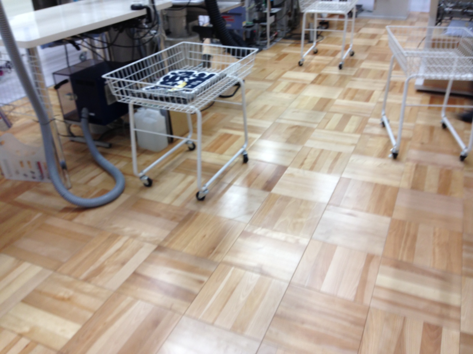 床は、ドライ機、乾燥機、ワッシャーの周辺を除き、木をタイル状に敷き詰め、見た目も美しく、足元の感触は「やさしい」ものでした。