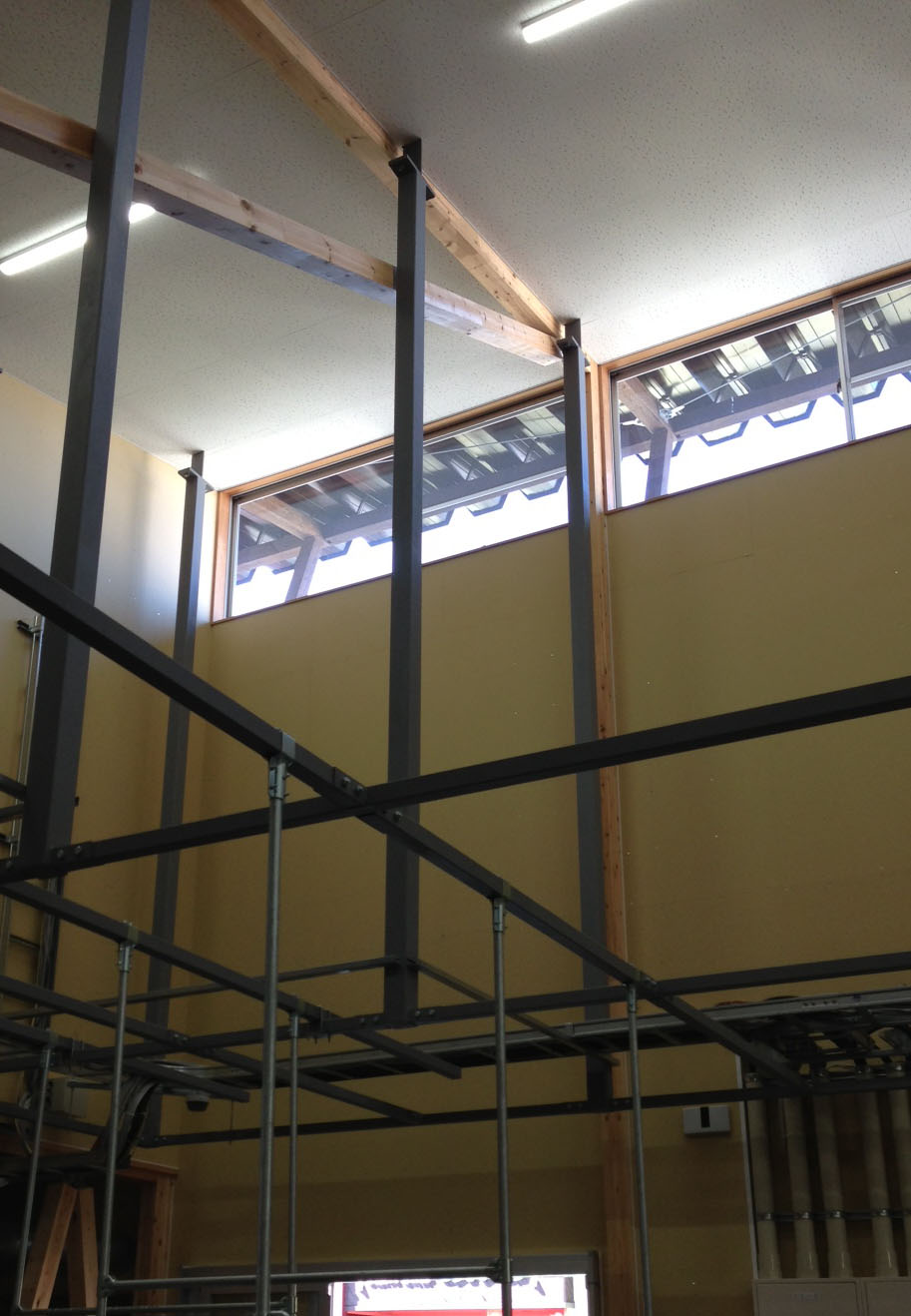 壁面は、空調の関係と思われますが通常の高さ(位置)には窓がなく、パネル(断熱材入り)で覆われていました。これを補うためと、換気・排気のために広く天窓が造られていました。