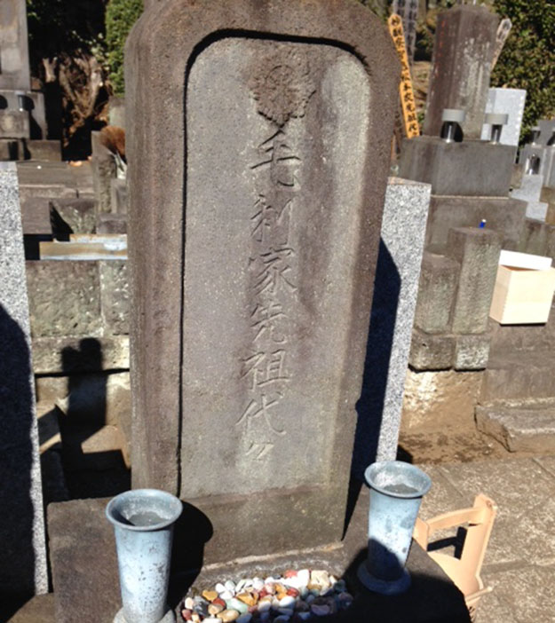 お墓の中央に刻まれた家紋は、毛利家の家紋で八剣輪宝紋という珍しいモノです。