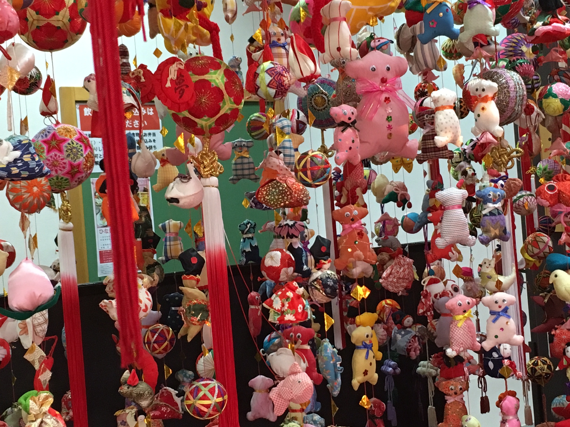 「さげもん」にはいくつかの決まりがあるそうで、約40cmの竹輪に赤白の布を巻きつけ、細工ものと柳川まりを交互に7列7個の49個をつるす。